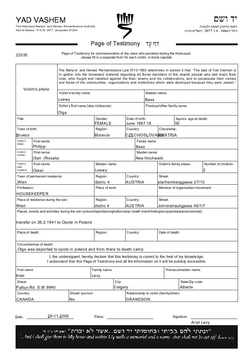 Olga Loewy née Bass est née à Bruenn, Tchécoslovaquie en 1887, fille de Philipp et de Rosalia Salia née Hochwald. Elle était Couvernante et Mariée à Oskar née Loewy. Avant la seconde guerre mondiale elle vivait à Wien, Autriche. Pendant la guerre, elle était à Wien, Autriche.
