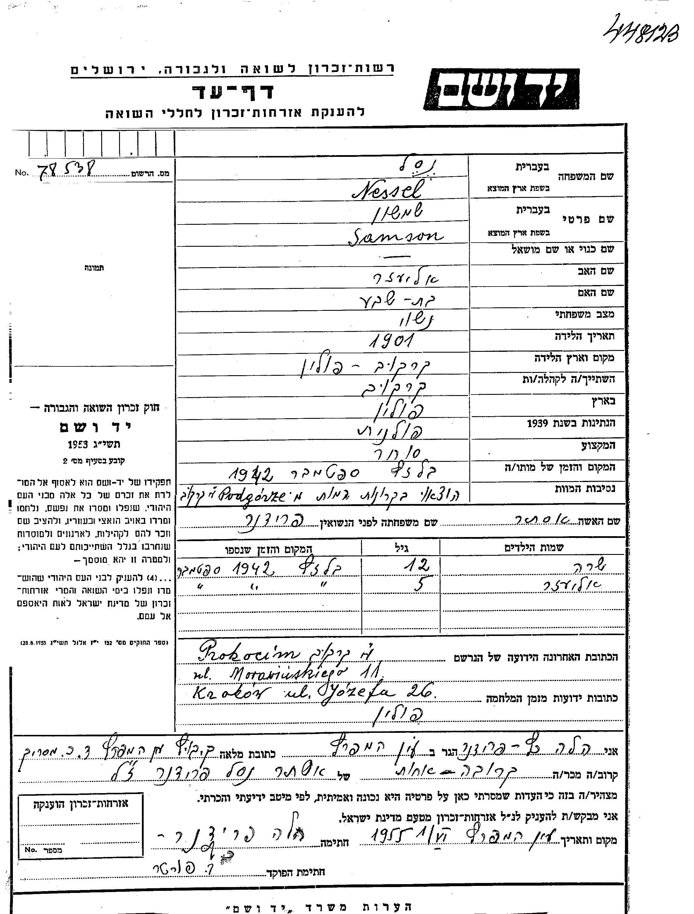 Nessel Shimshon 1901 Krakow, Pologne Feuille de témoignage