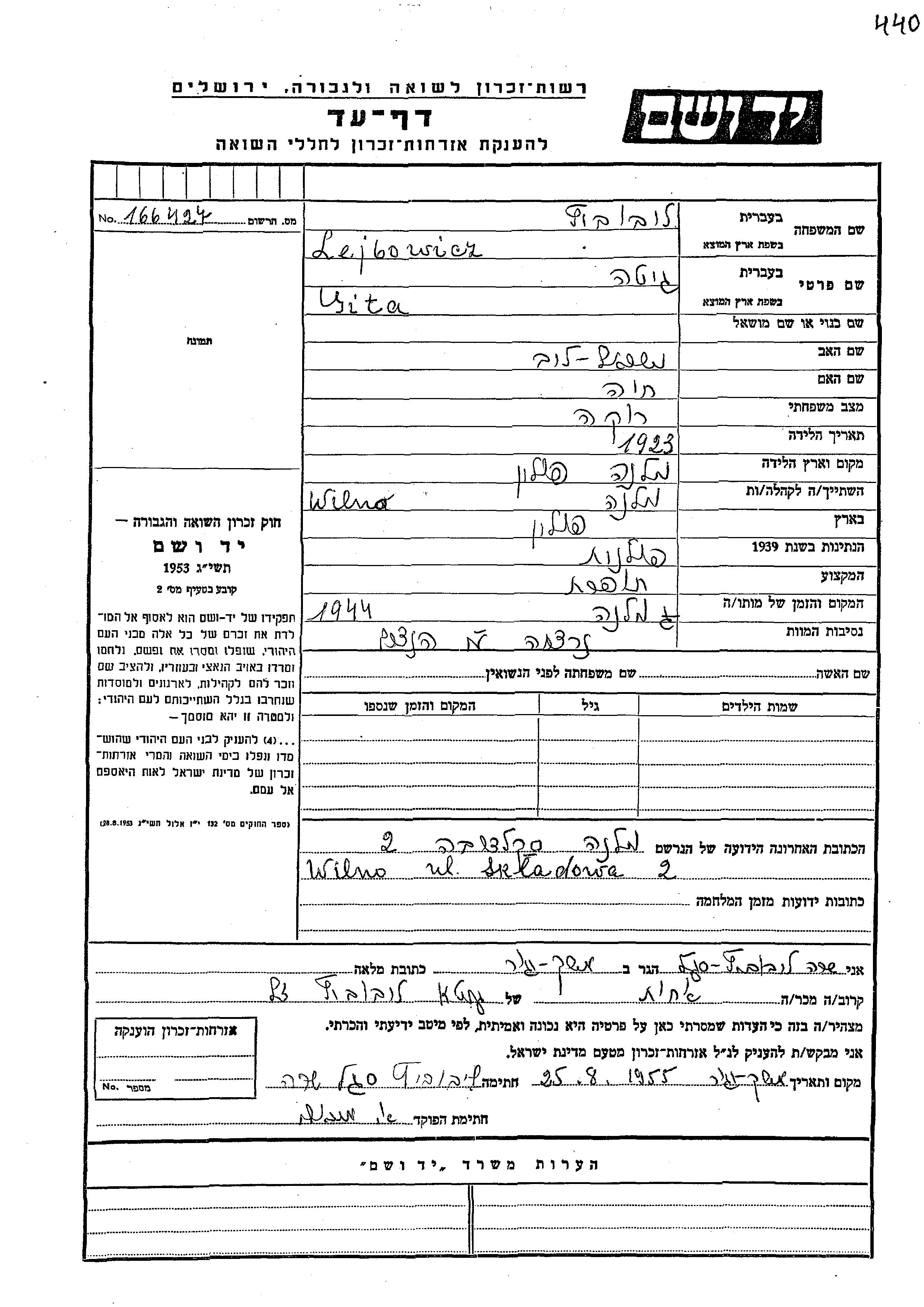 Lejbowicz Gita 1923 Wilno, Pologne Feuille de témoignage