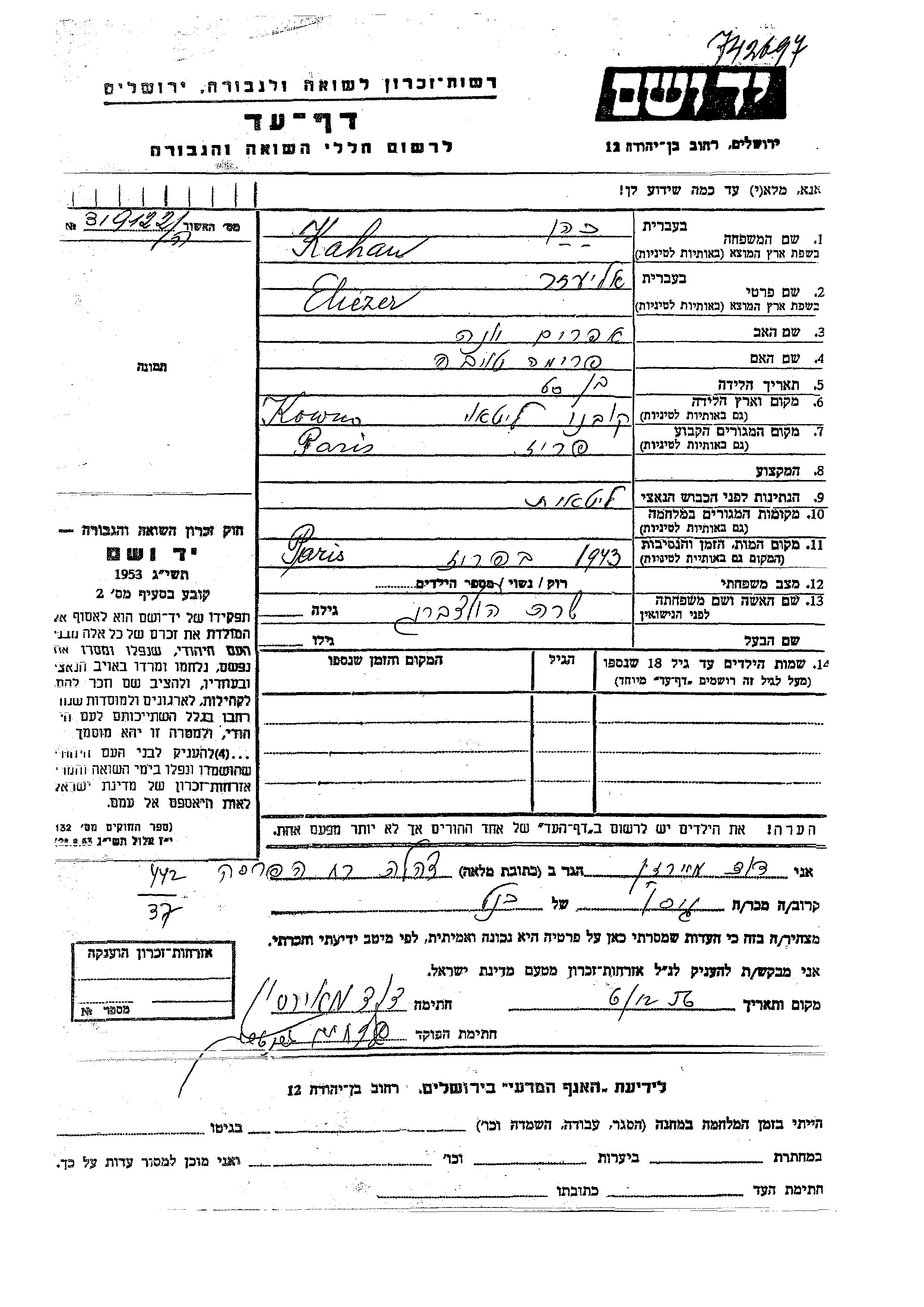 Kahan Eliezer Paris, France Feuille de témoignage