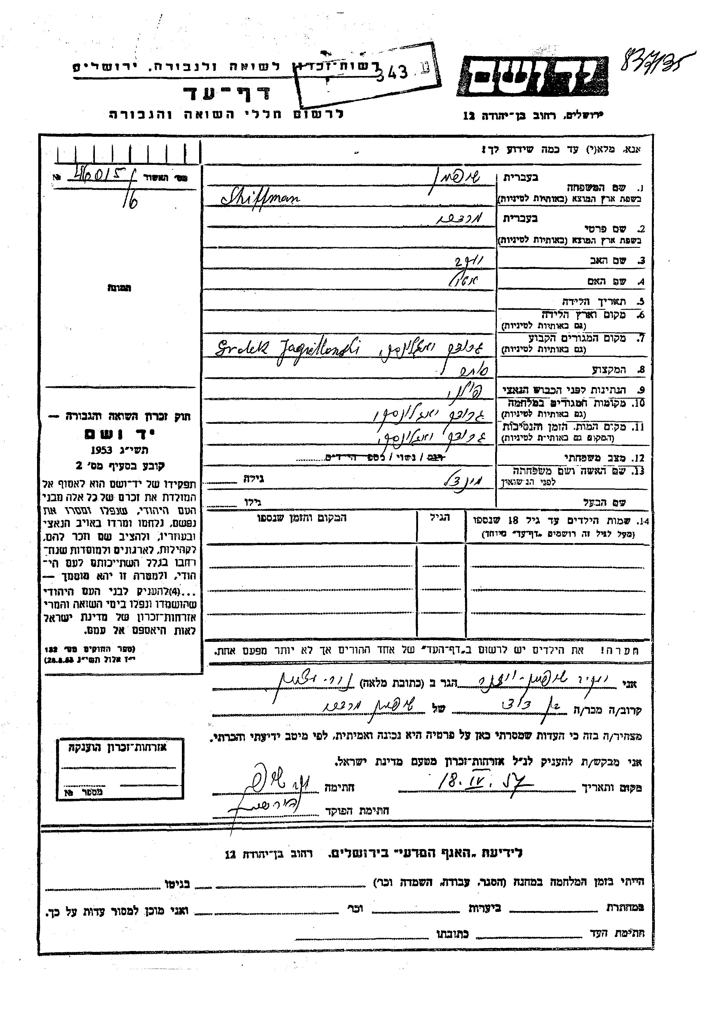 Mordekhai Shiffman est né fils de Yaakov et de Matul. Il était Commerçant/e et Mariée à Midl. Avant la seconde guerre mondiale il vivait à Grodek Jagiellonski, Pologne. Au cours de la guerre, il était à Grodek Jagiellonski, Pologne.