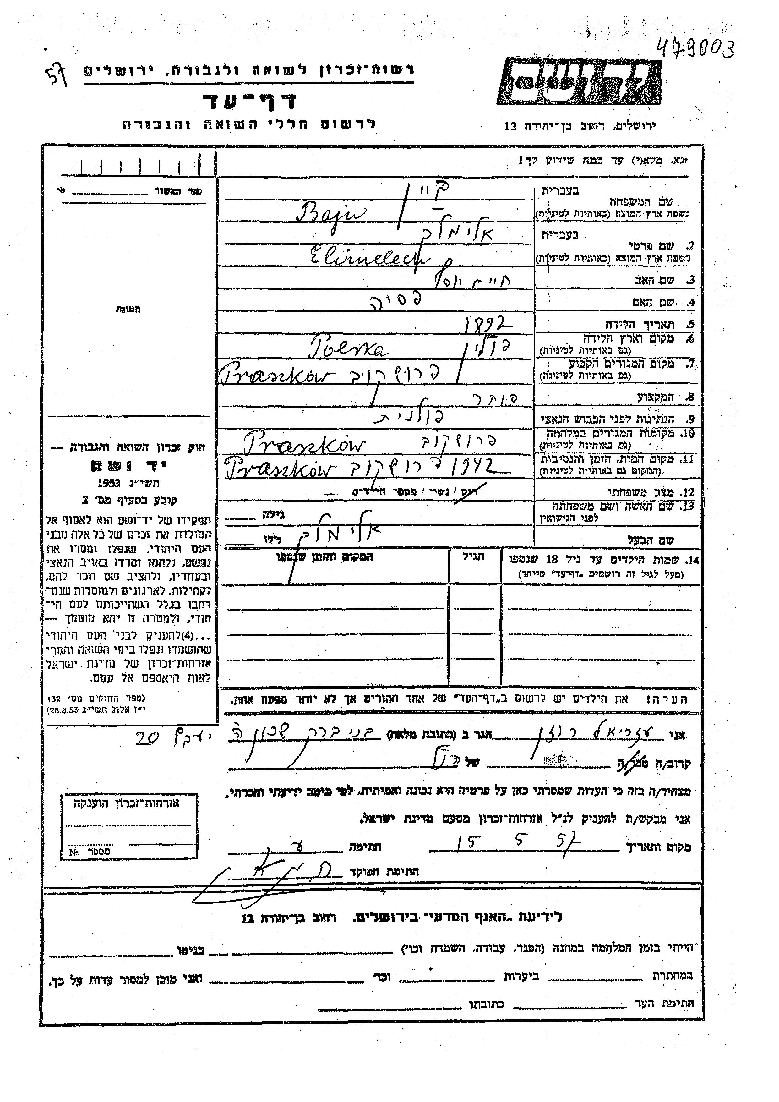 Bajn Elimelech 1892 Praszkow, Pologne Feuille de témoignage
