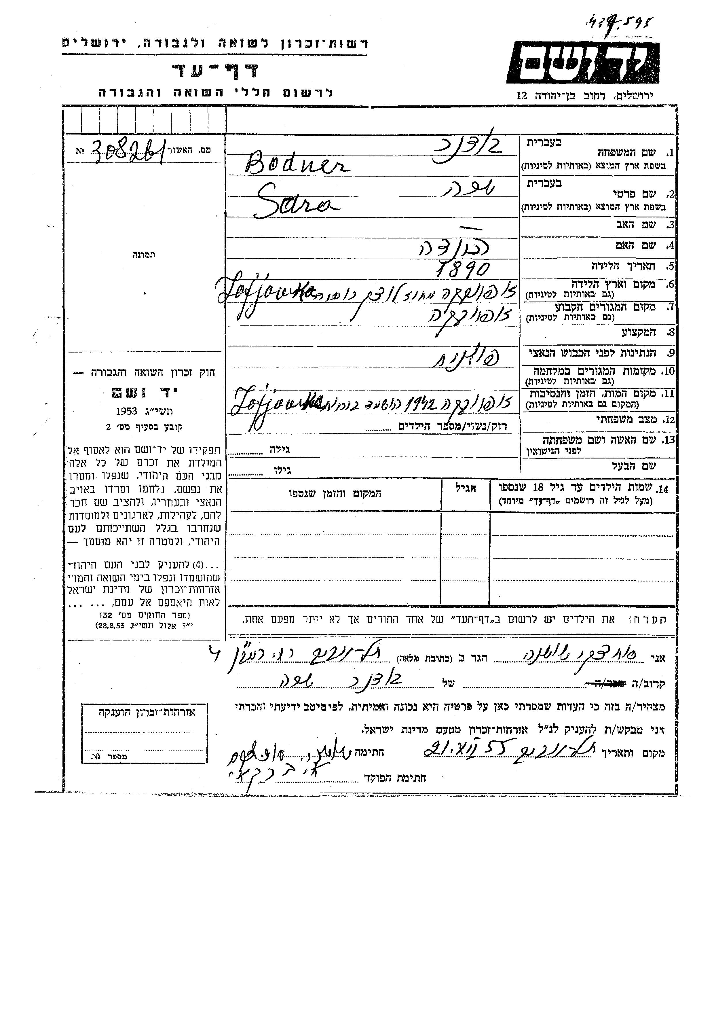 Bodner Sara 1890 Zofjówka, Pologne Feuille de témoignage