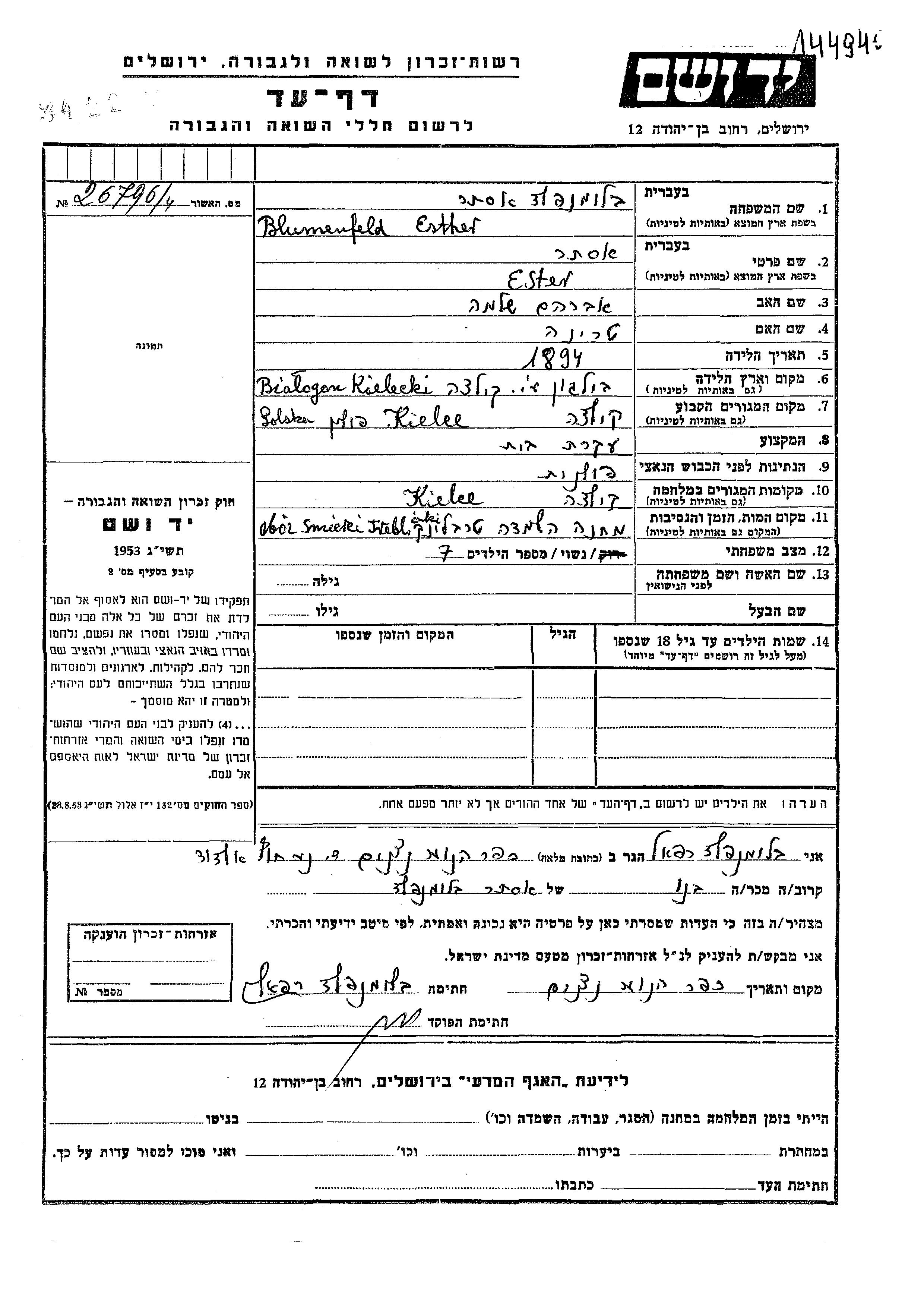 Blumenfeld Ester 1894 Kielce, Pologne Feuille de témoignage