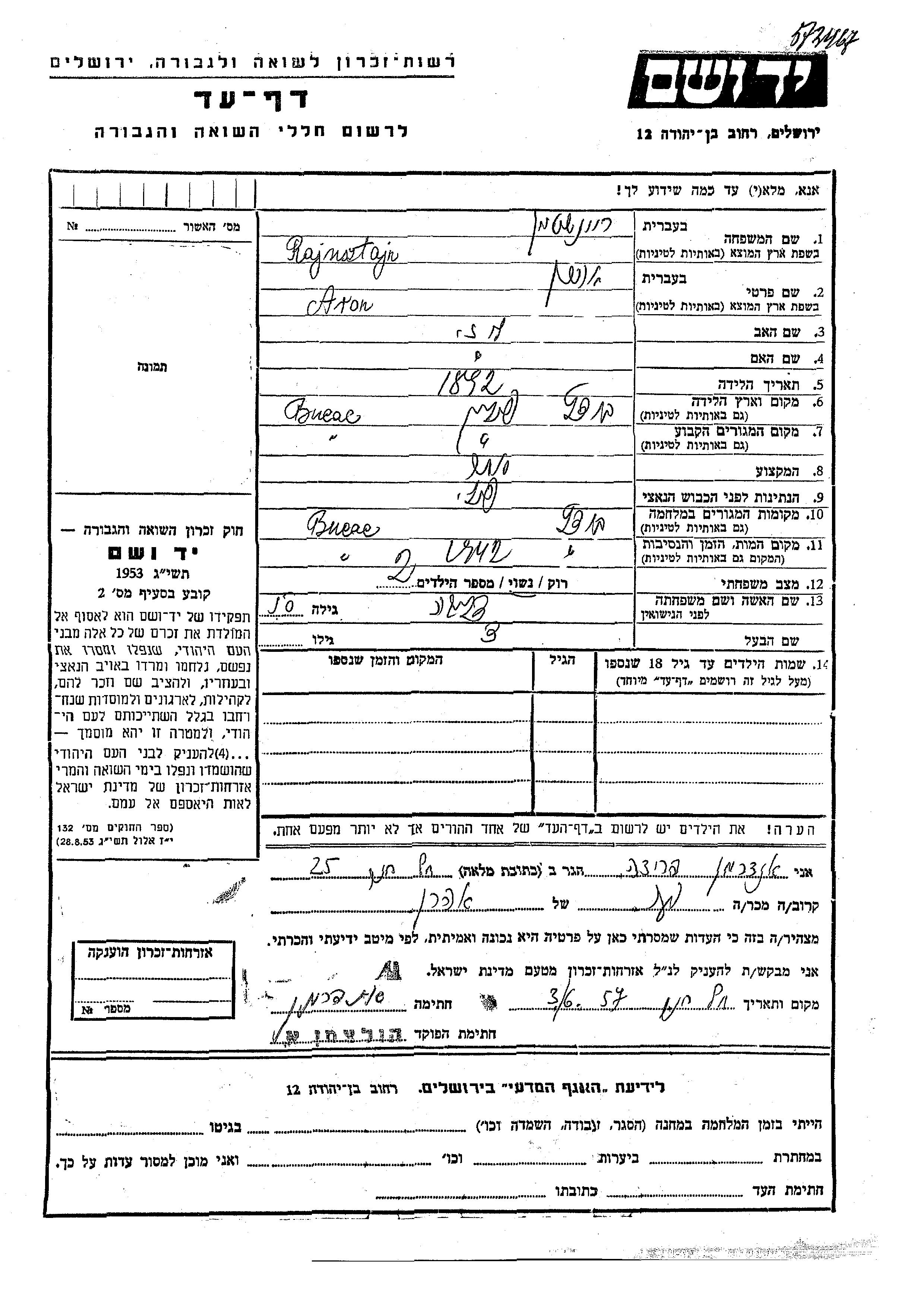 Rajnsztajn Aron 1892 Bucac, Pologne Feuille de témoignage