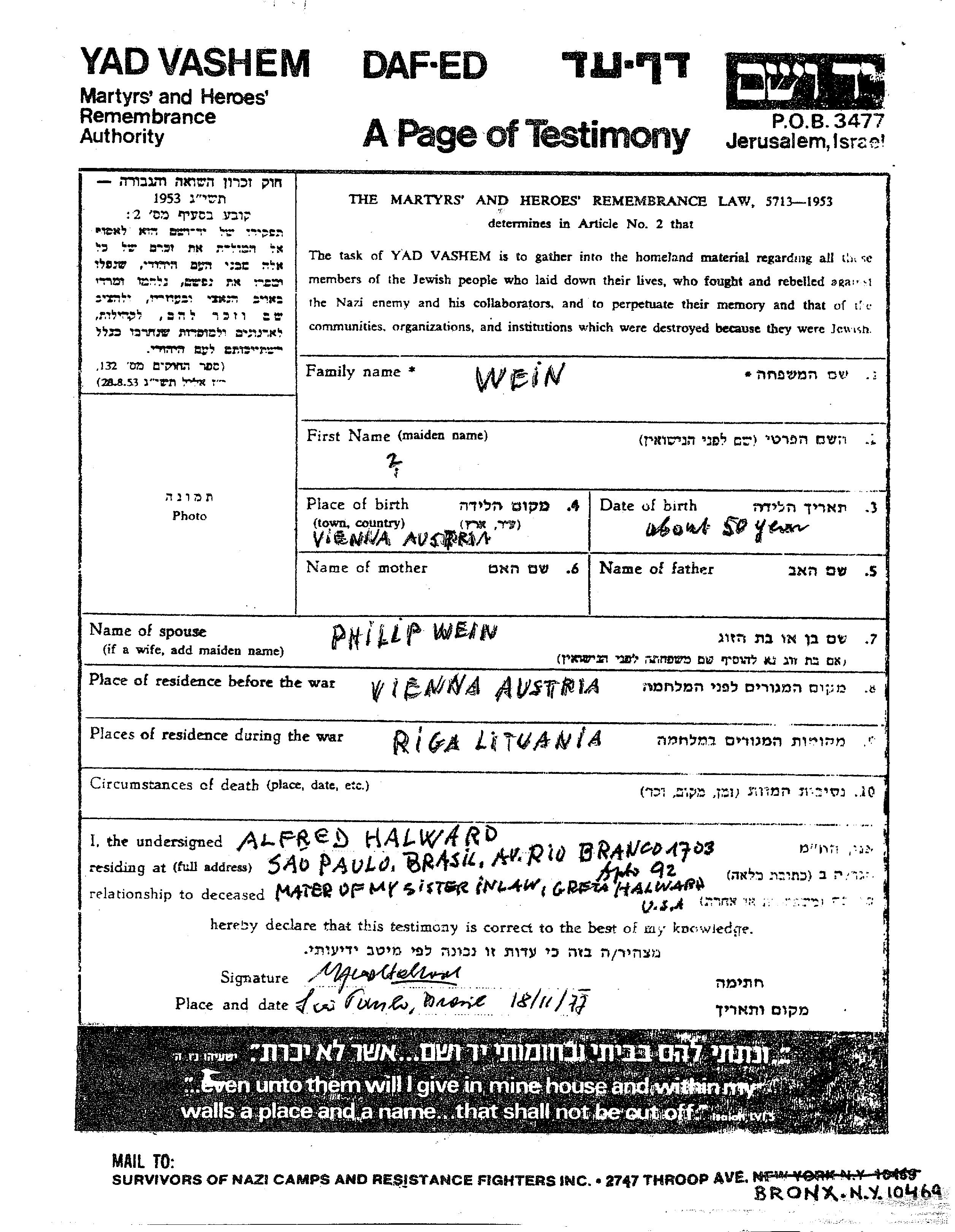 prénom inconnu Wein est née à Wien, Autriche. Elle était Mariée à Philip. Avant la seconde guerre mondiale elle vivait à Wien, Autriche. Pendant la guerre, elle était à Riga, Lettonie.
