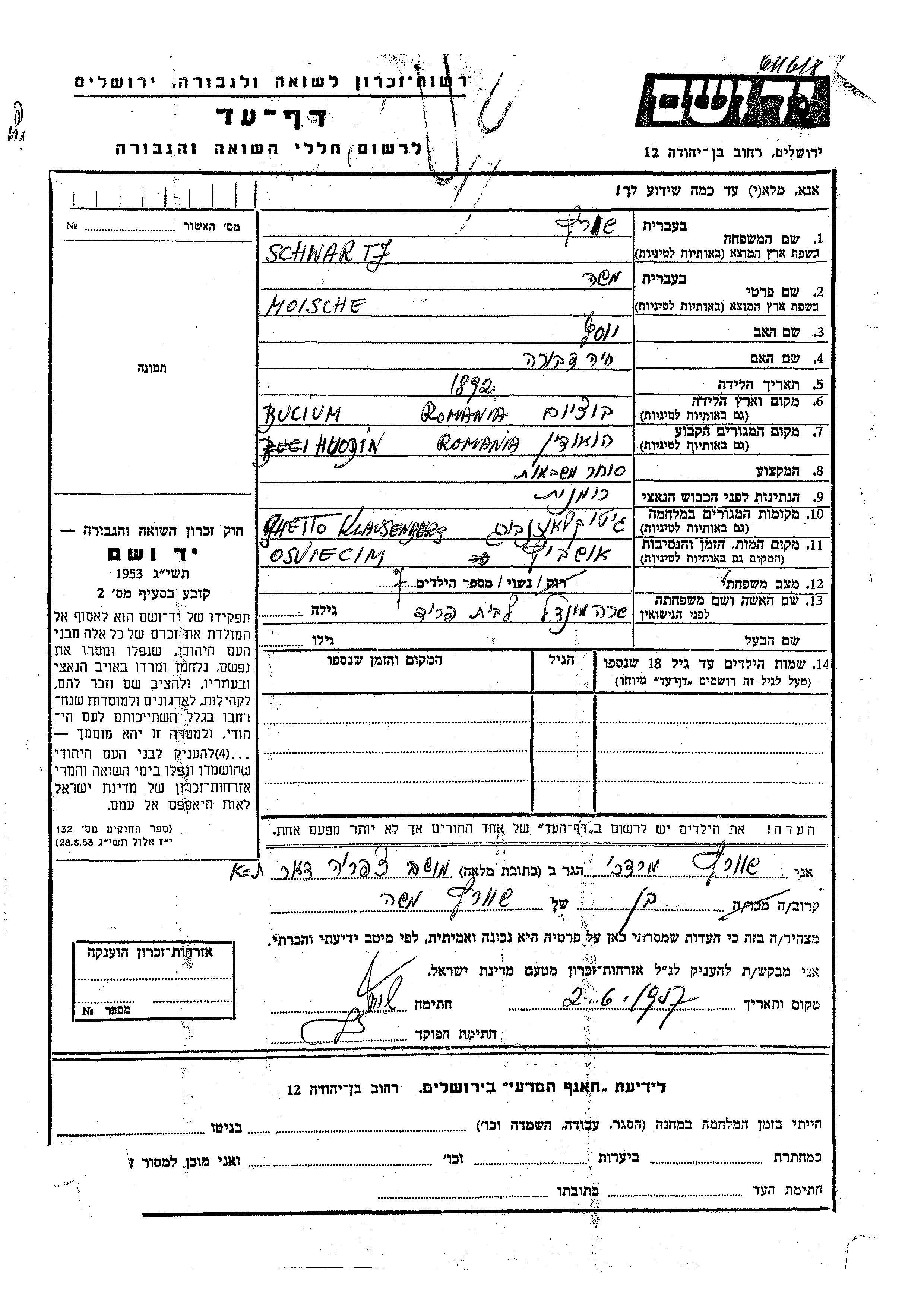 Moische Schwartz est né à Bucium, Roumanie en 1892, fils de Yosef et de Khaia Dvora. Il était Marchand de boissons et Mariée à Sara Mindl née Frid. Avant la seconde guerre mondiale il vivait à Huodin, Roumanie. Au cours de la guerre, il était à Klausenburg, Roumanie.