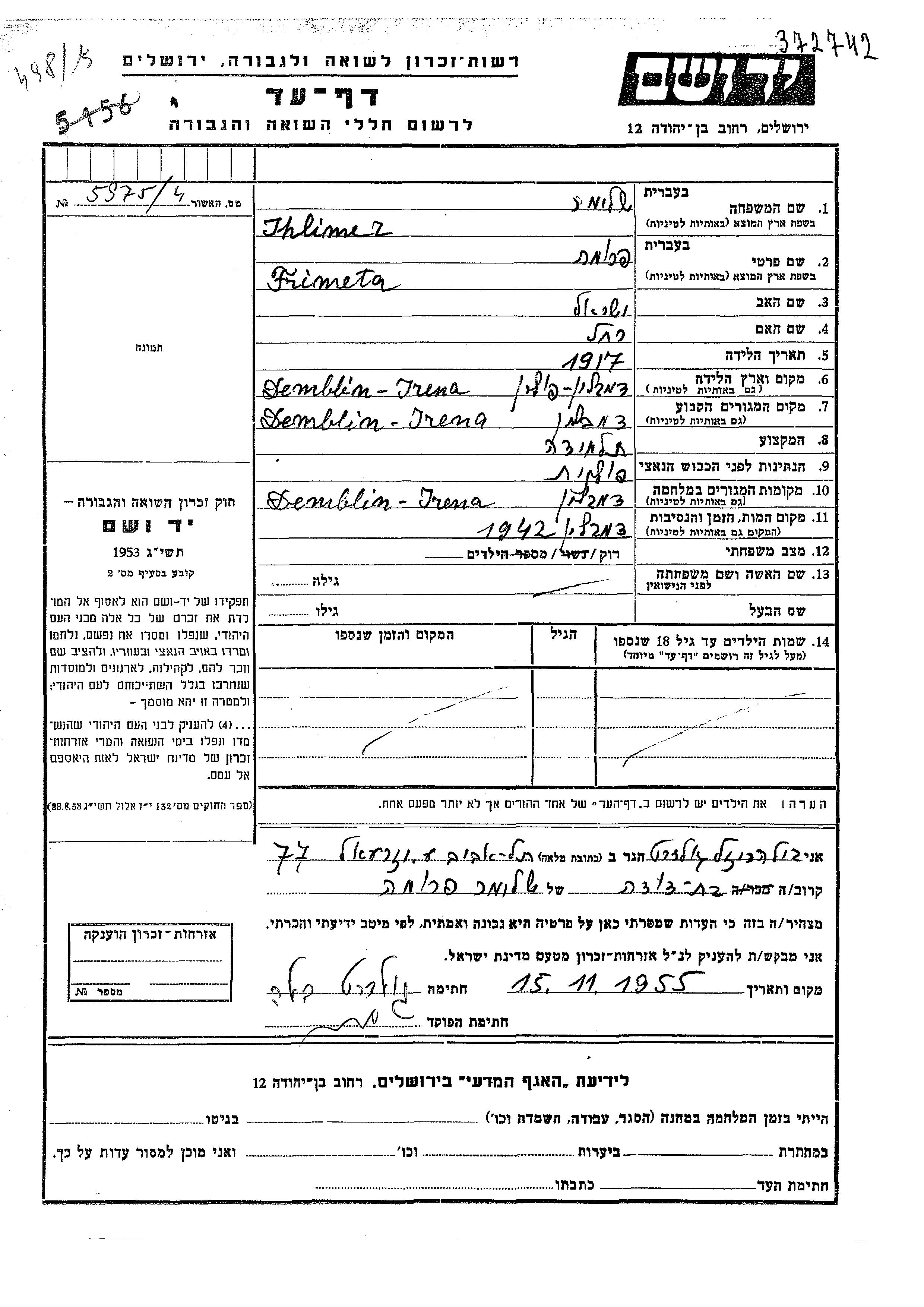 Frimeta Shlimer est née à Demblin, Pologne en 1917, fille de Yisrael et de Rakhel. Elle était Élève et Célibataire. Avant la seconde guerre mondiale elle vivait à Demblin, Pologne. Pendant la guerre, elle était à Demblin, Pologne.