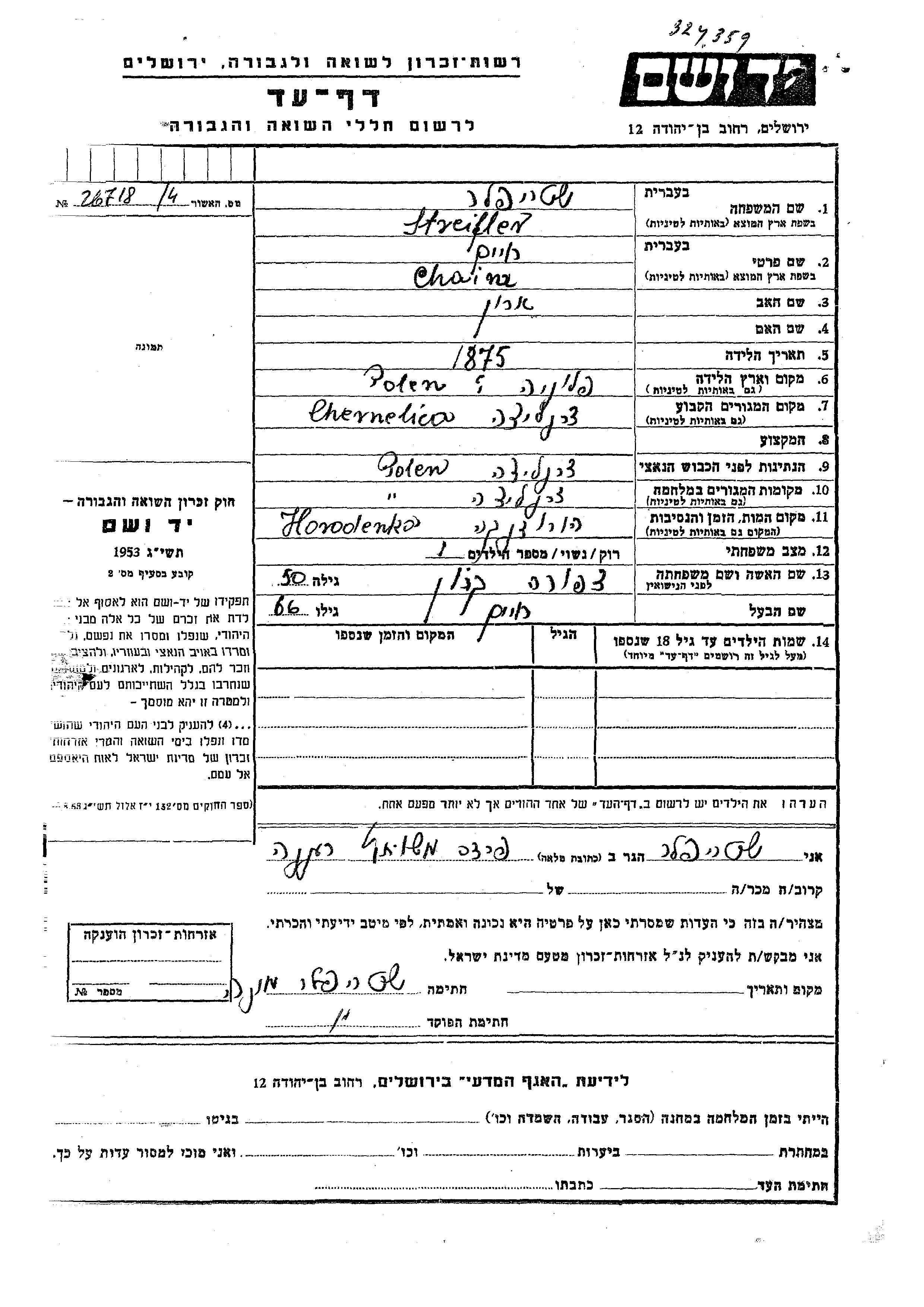 Streifler Chaim 1875 Chernelitsa, Pologne Feuille de témoignage