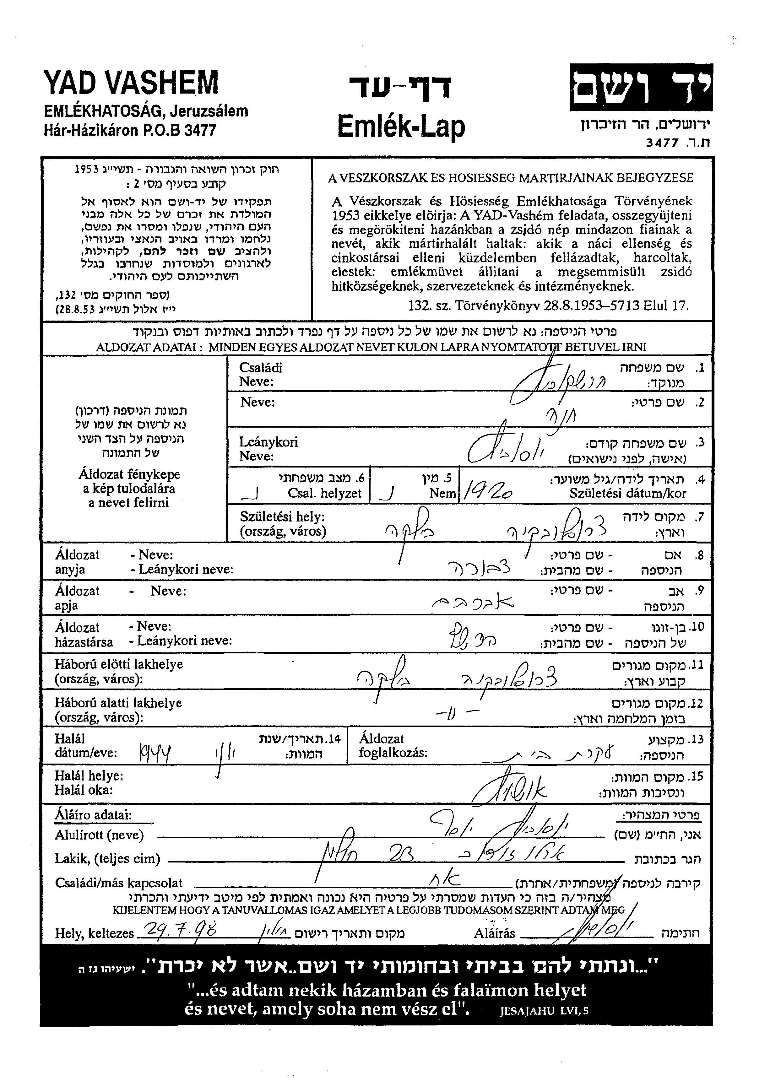 Hershkovitz Khana 1920 endroit inconnu, Feuille de témoignage