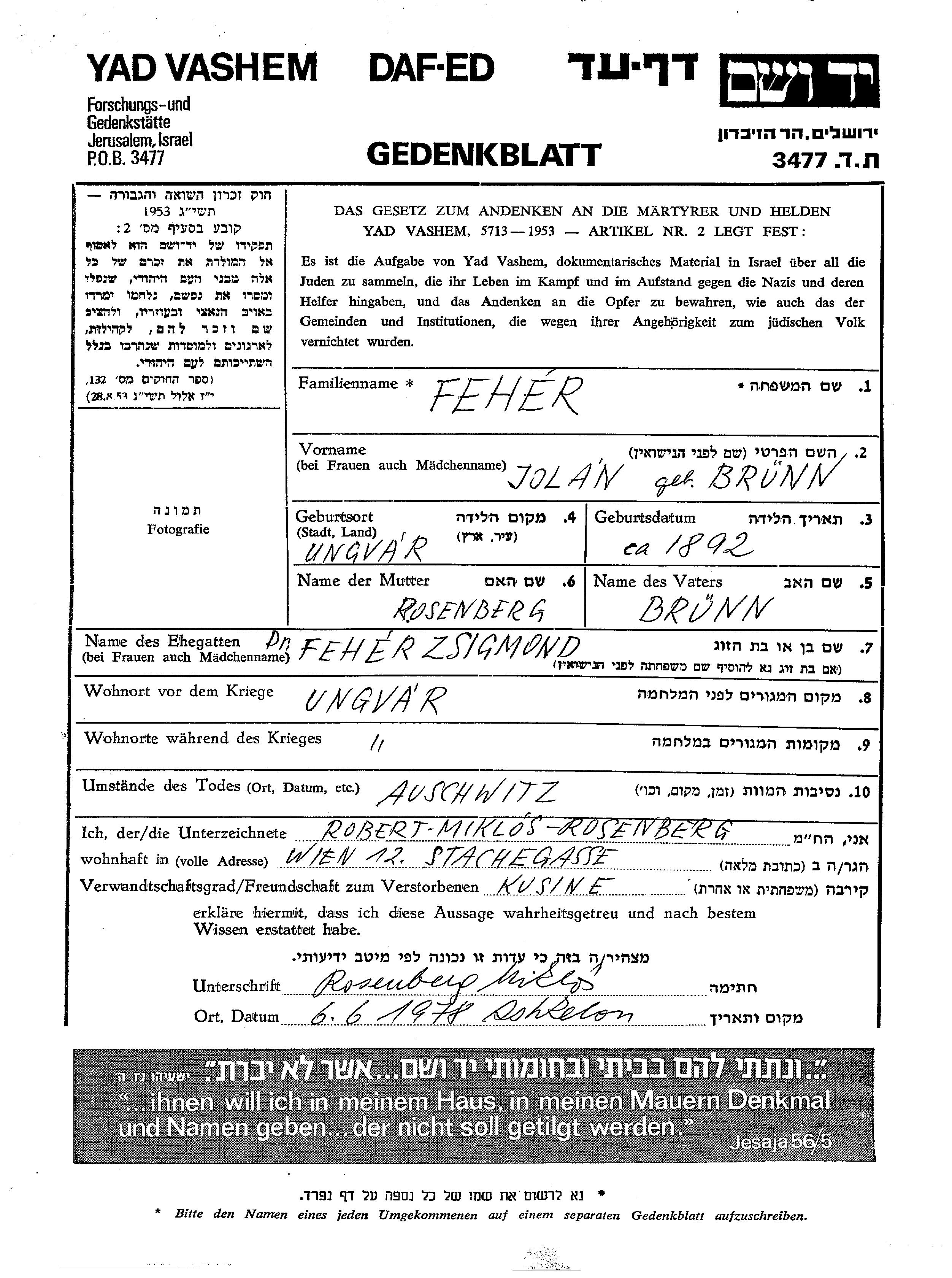 Jolan Feher née Brunn est née à Ungvar, Tchécoslovaquie en 1892. Elle était Mariée à Zsigmond. Avant la seconde guerre mondiale elle vivait à Ungvar, Tchécoslovaquie. Pendant la guerre, elle était à Ungvar, Tchécoslovaquie.