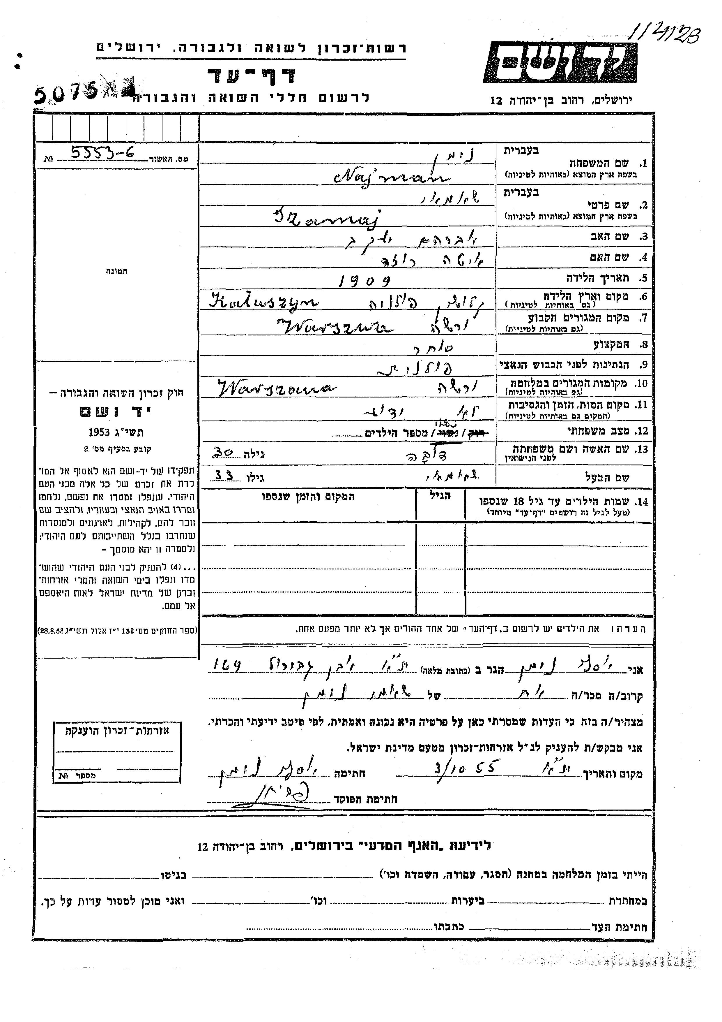 Najman Niman Szamaj 1909 Warszawa, Pologne Feuille de témoignage