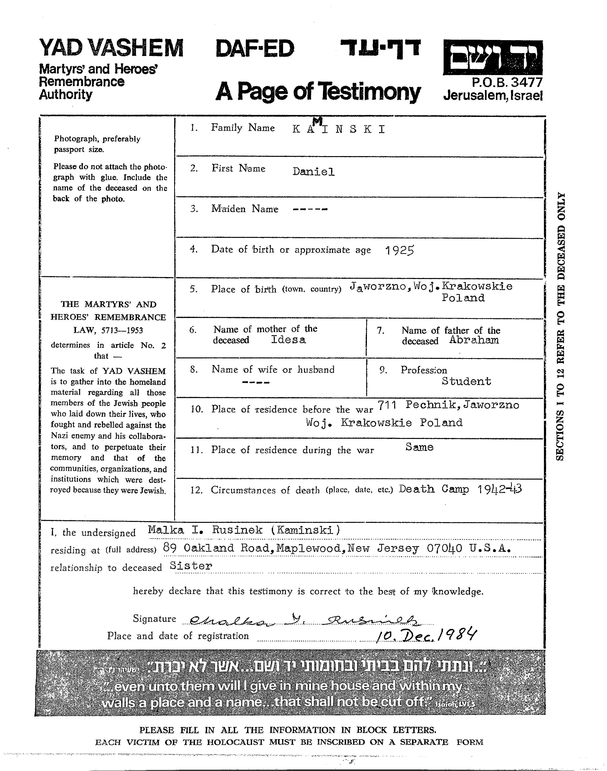 Kaminski Daniel 1925 Jaworzno, Pologne Feuille de témoignage
