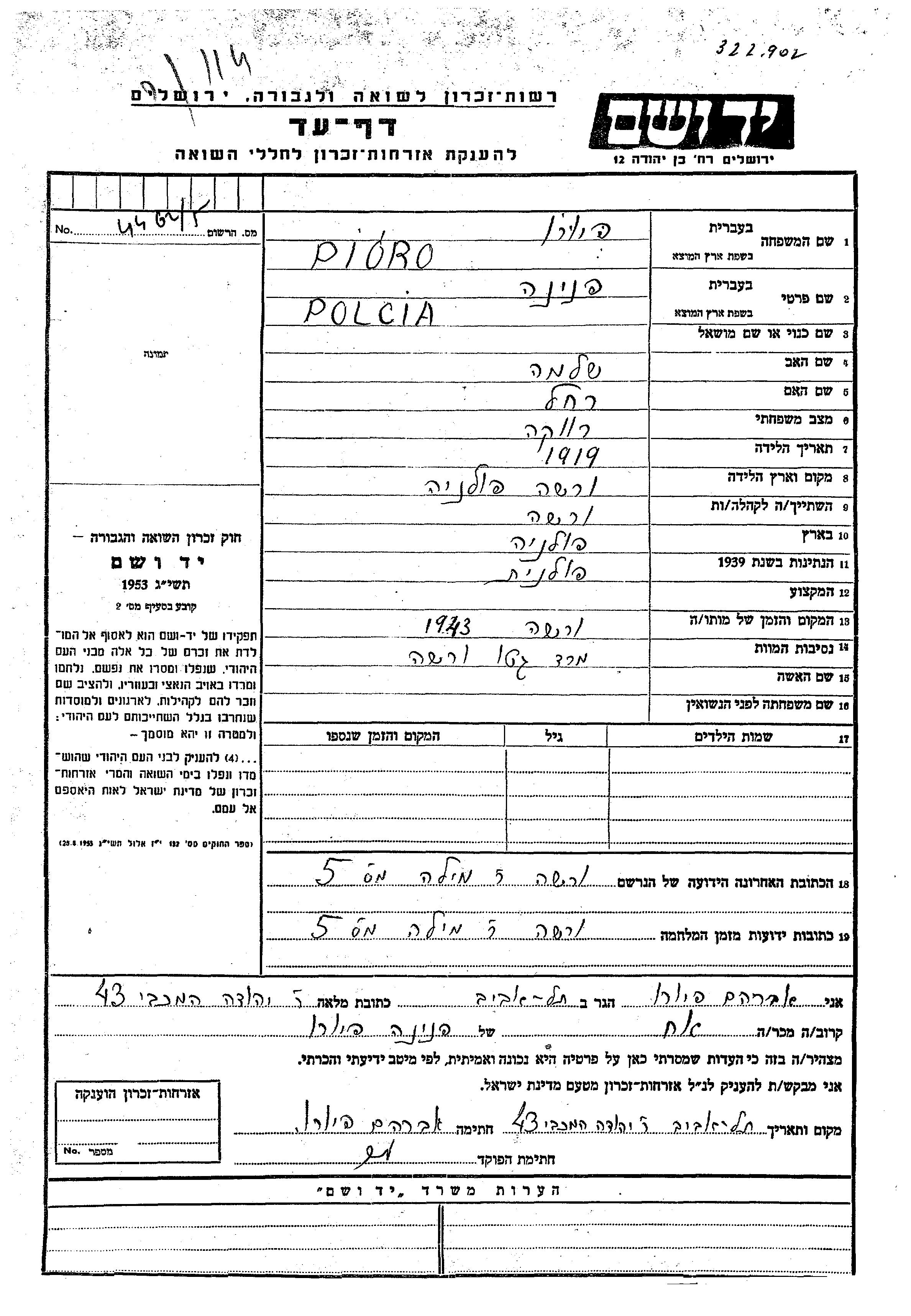 Polcia Pnina Pioro est née à Warsaw, Pologne en 1919, fille de Shlomo et de Rakhel. Elle était Célibataire. Avant la seconde guerre mondiale elle vivait à Warsaw, Pologne. Pendant la guerre, elle était à Warsaw, Pologne.