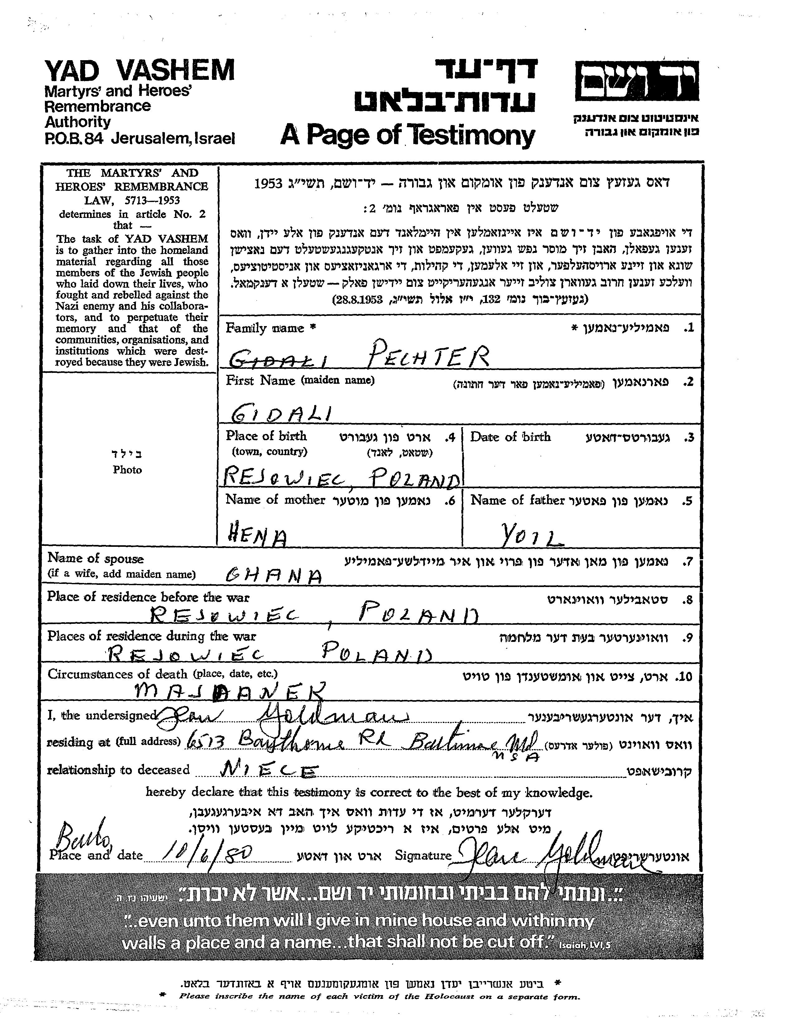 Pechter Gedalia Rejowiec, Pologne Feuille de témoignage