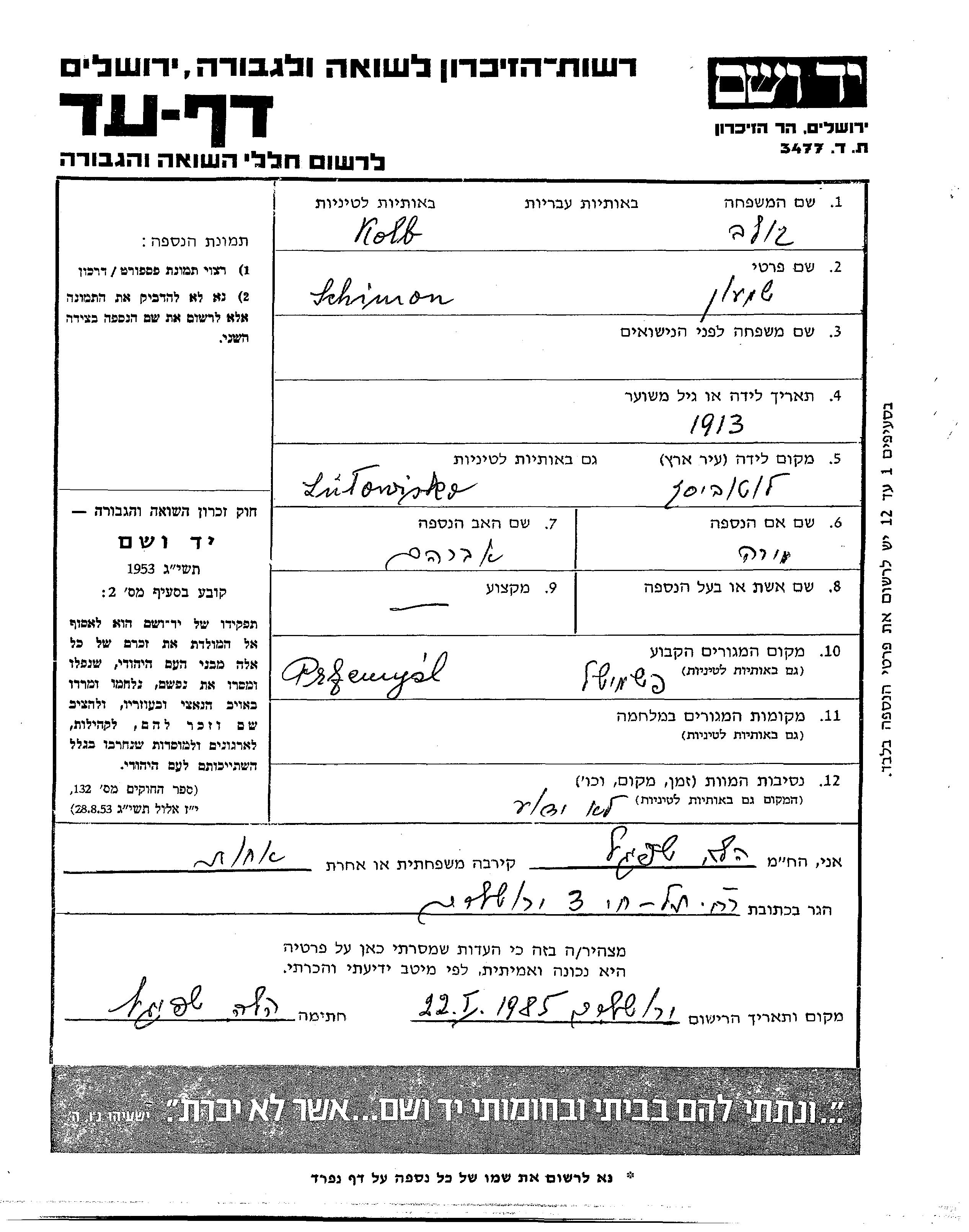 Kolb Schimon 1913 Przemysl, Pologne Feuille de témoignage