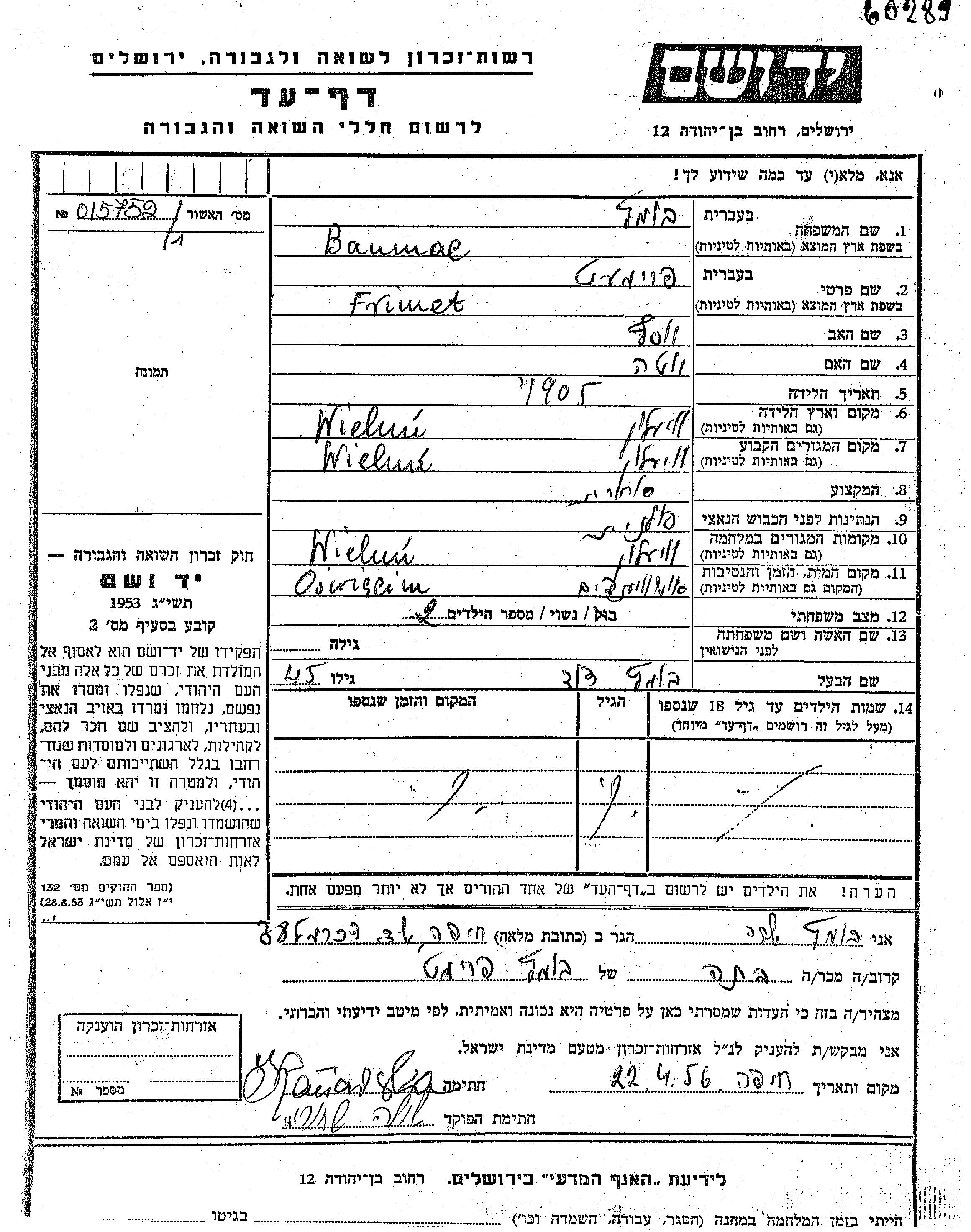 Frimet Baumac est née à Wielun, Pologne en 1905, fille de Yosef et de Eta. Elle était Commerçant/e et Mariée à David. Avant la seconde guerre mondiale elle vivait à Wielun, Pologne. Pendant la guerre, elle était à Wielun, Pologne.