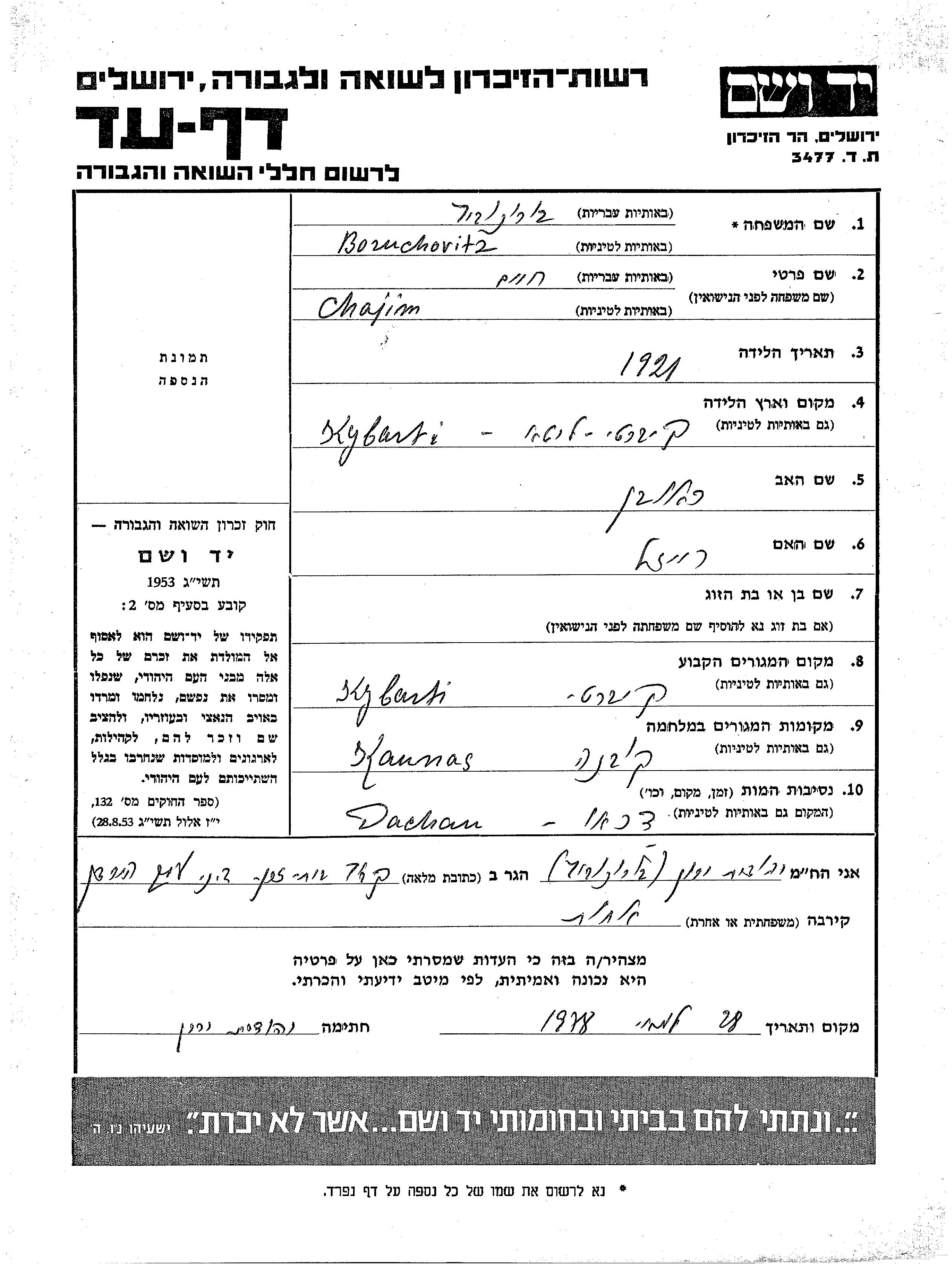 Boruchovitz Chajim 1921 Kybartai, Lituanie Feuille de témoignage