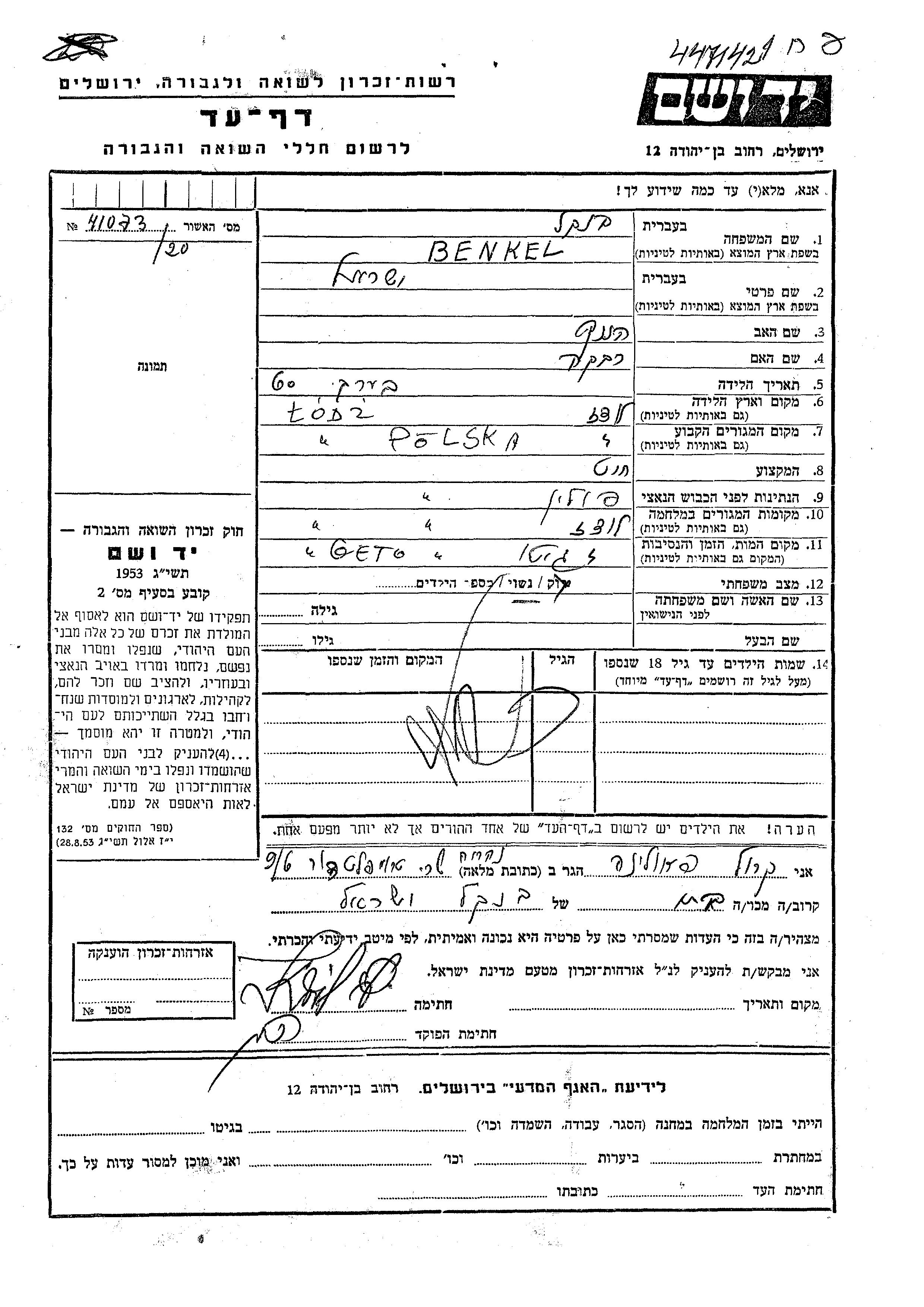 Benkel Yisrael Lodz, Pologne Feuille de témoignage