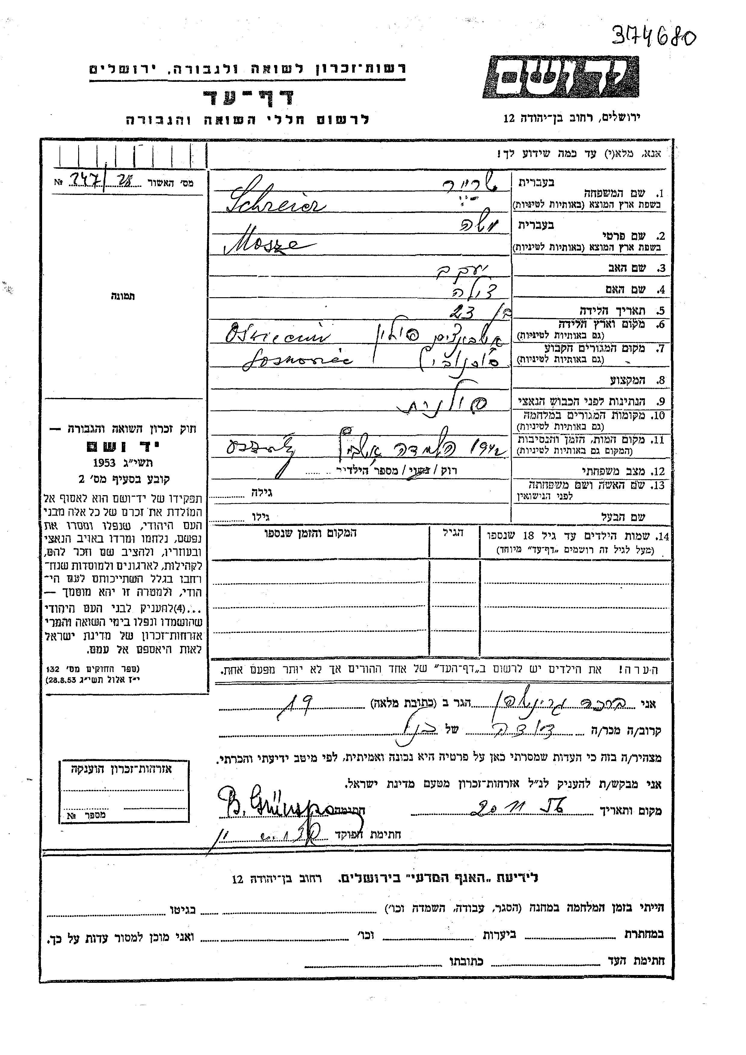 Mosze Schreier est né à Oświęcim, Pologne, fils de Yaakov et de Tzila. Il était Célibataire. Avant la seconde guerre mondiale il vivait à Sosnowiec, Pologne.