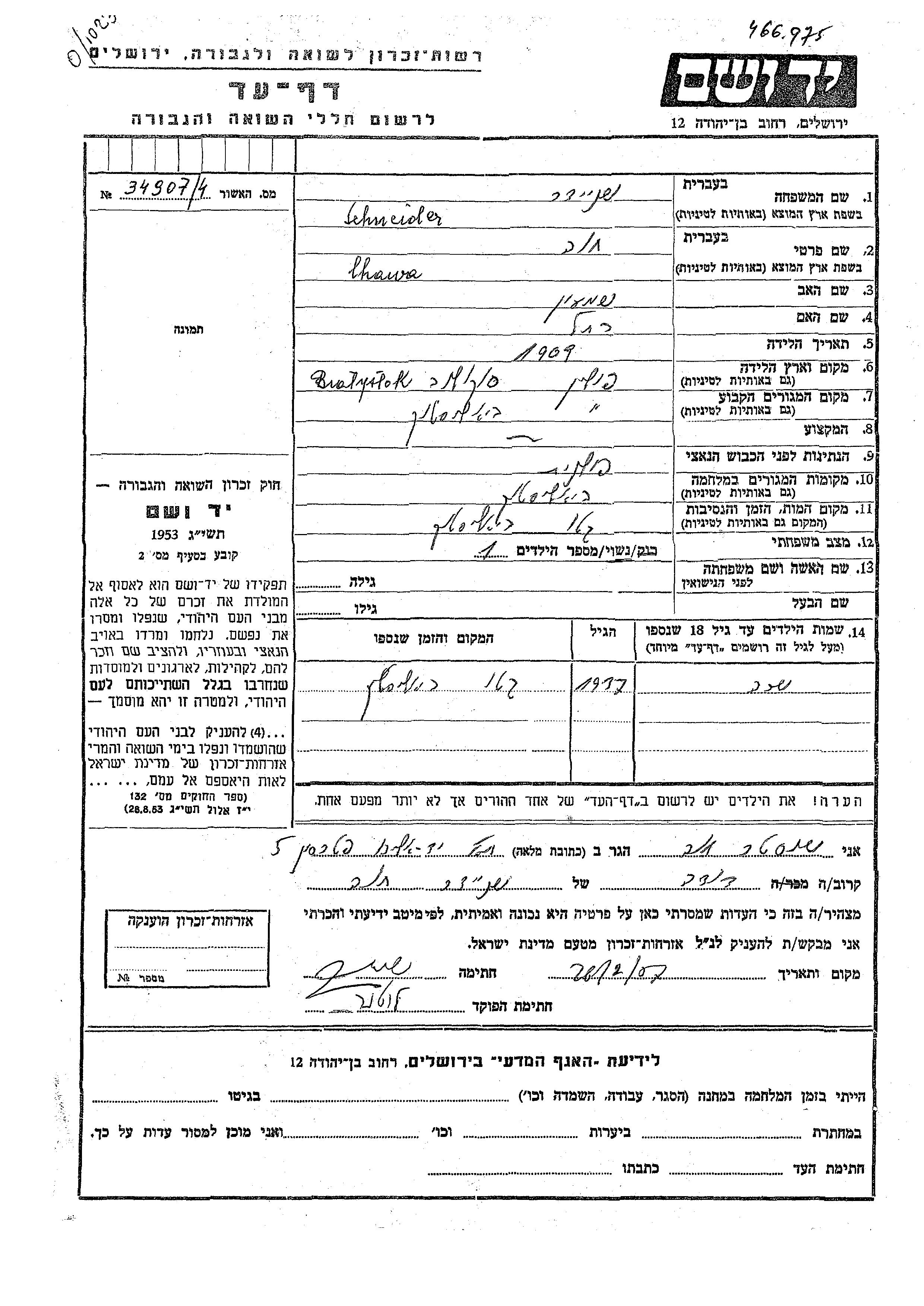 Schneider Chana Khava 1909 Bialistok, Pologne Feuille de témoignage