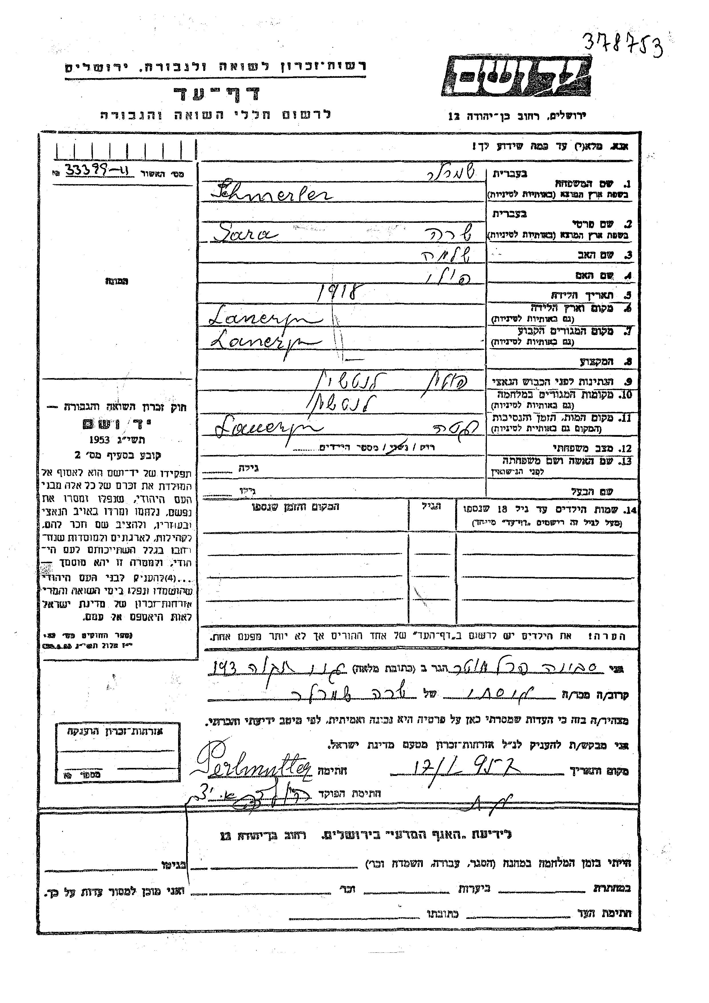Schmerler Sara 1918 Lanczyn, Pologne Feuille de témoignage