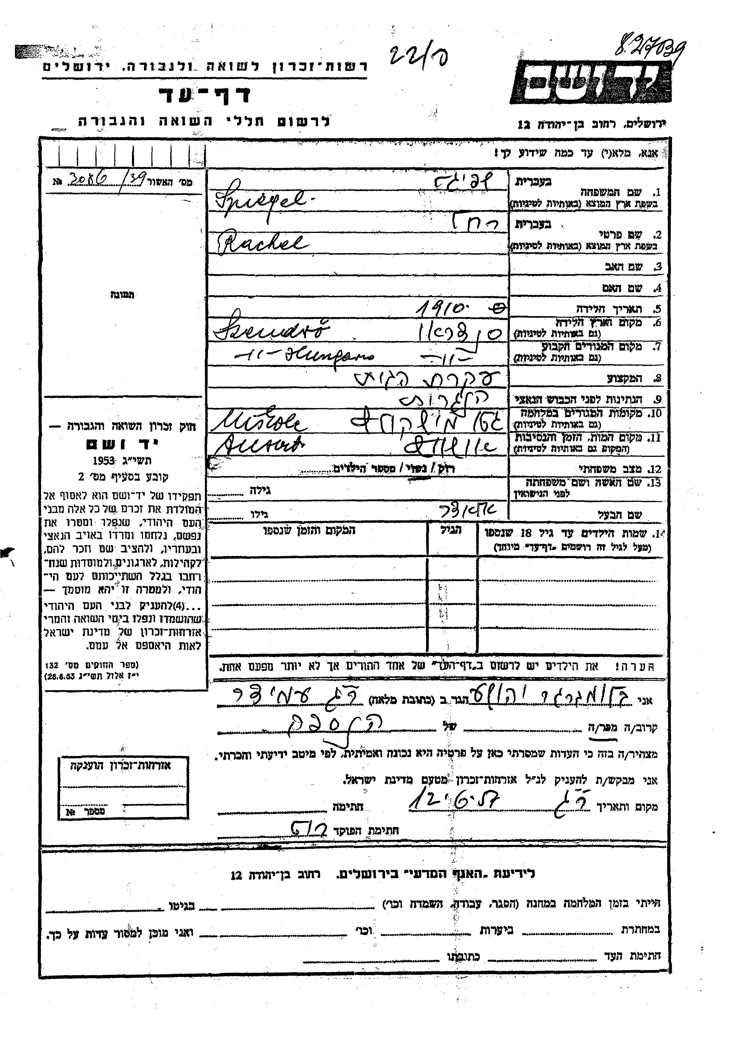 Spiegel Rachel 1910 Szendro, Hongrie Feuille de témoignage
