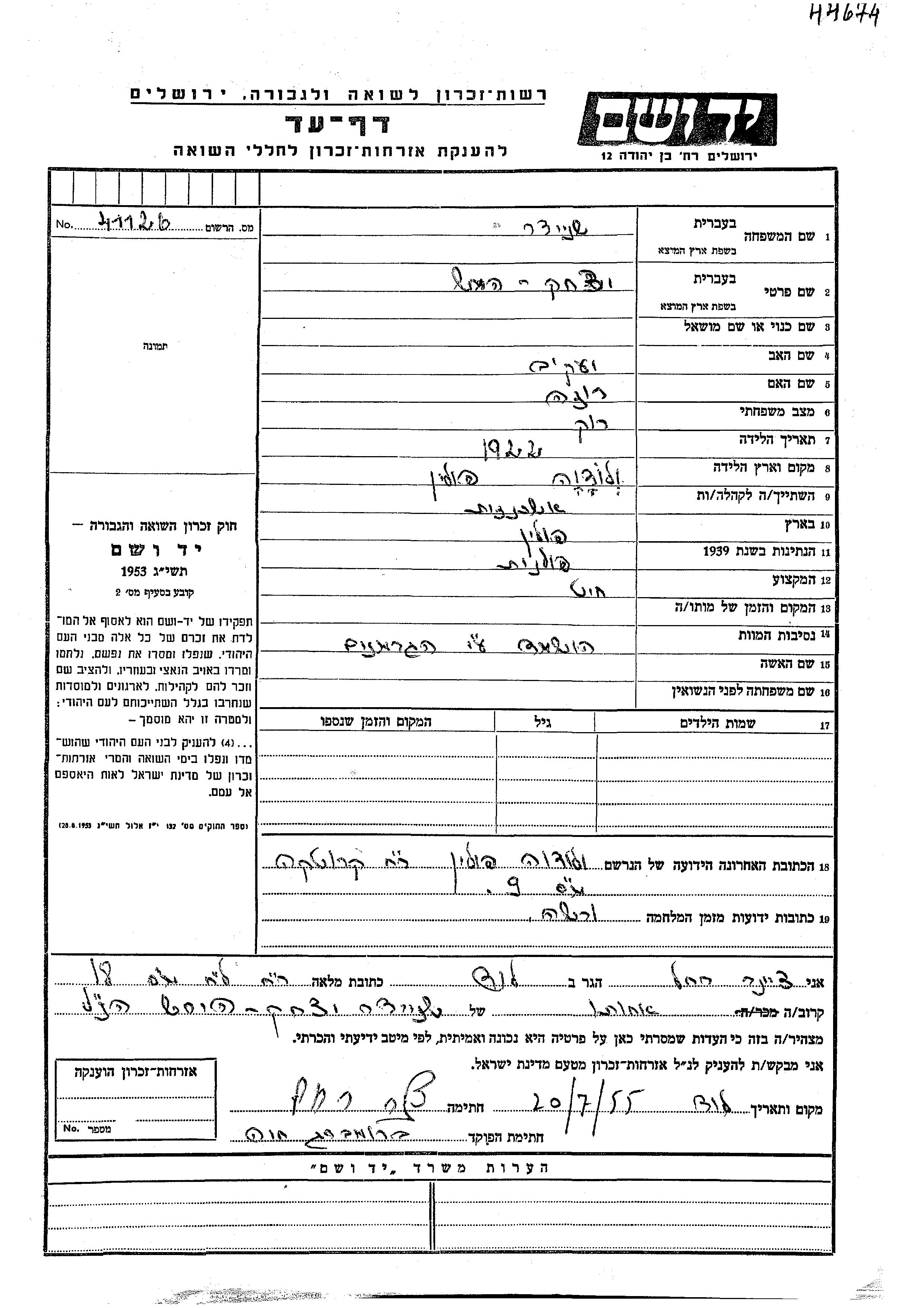 Yad Vashem - Pages of Testimony Names Memorial Collection