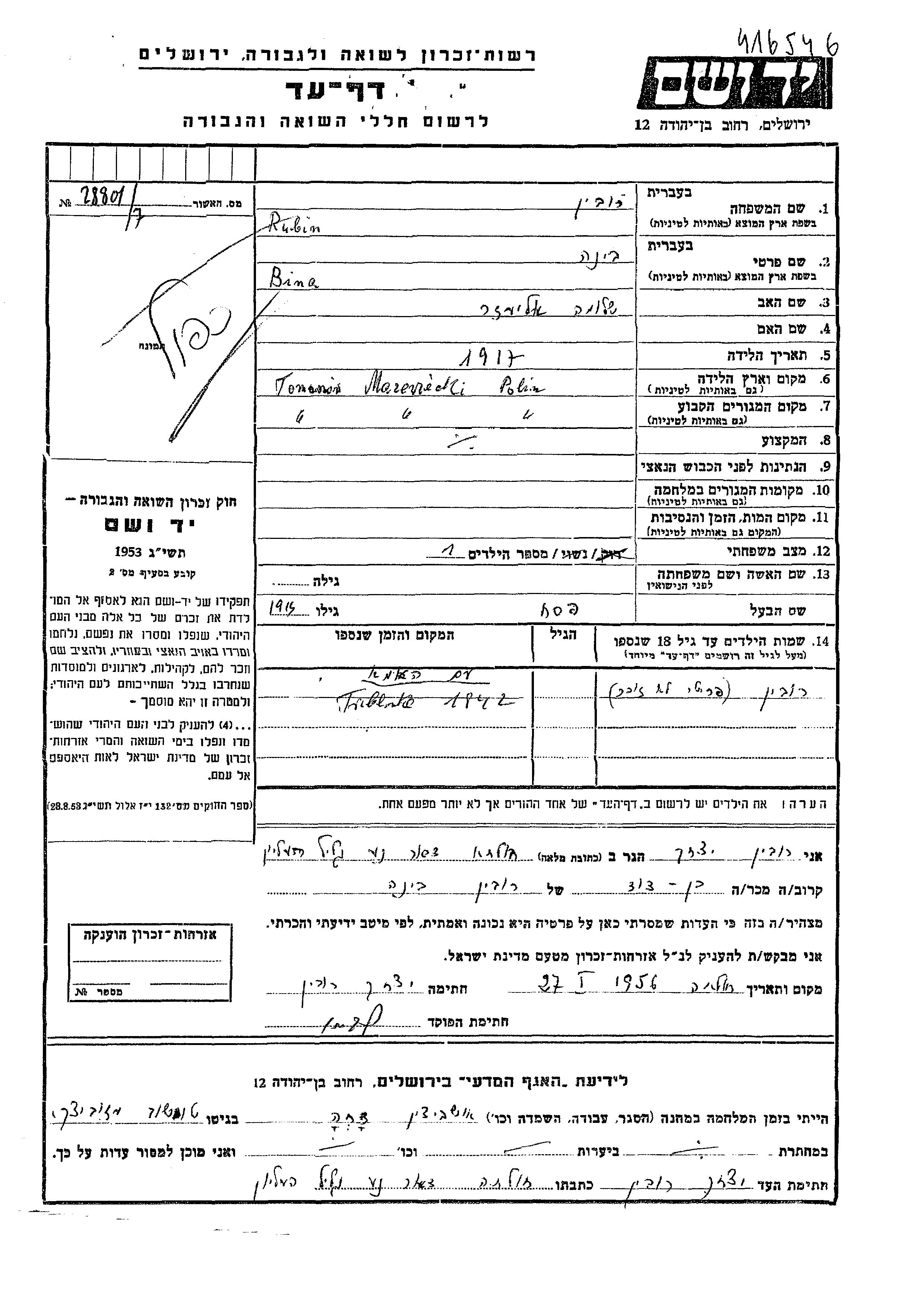 Rubin Bina 1917 Tomaszow Mazowieckie, Pologne Feuille de témoignage