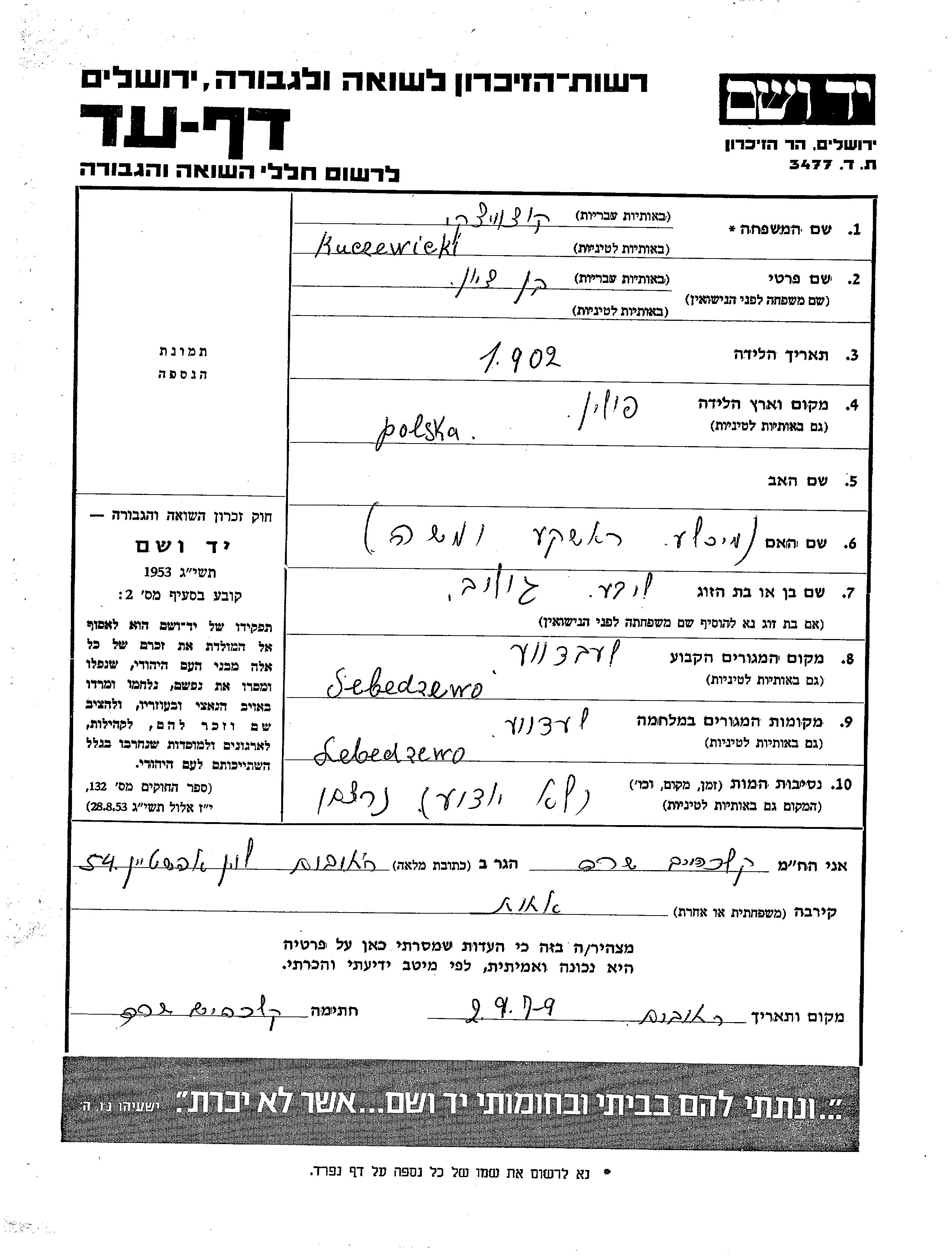 Kuczewicki Bentzion 1902 Lebedzeva, Pologne Feuille de témoignage