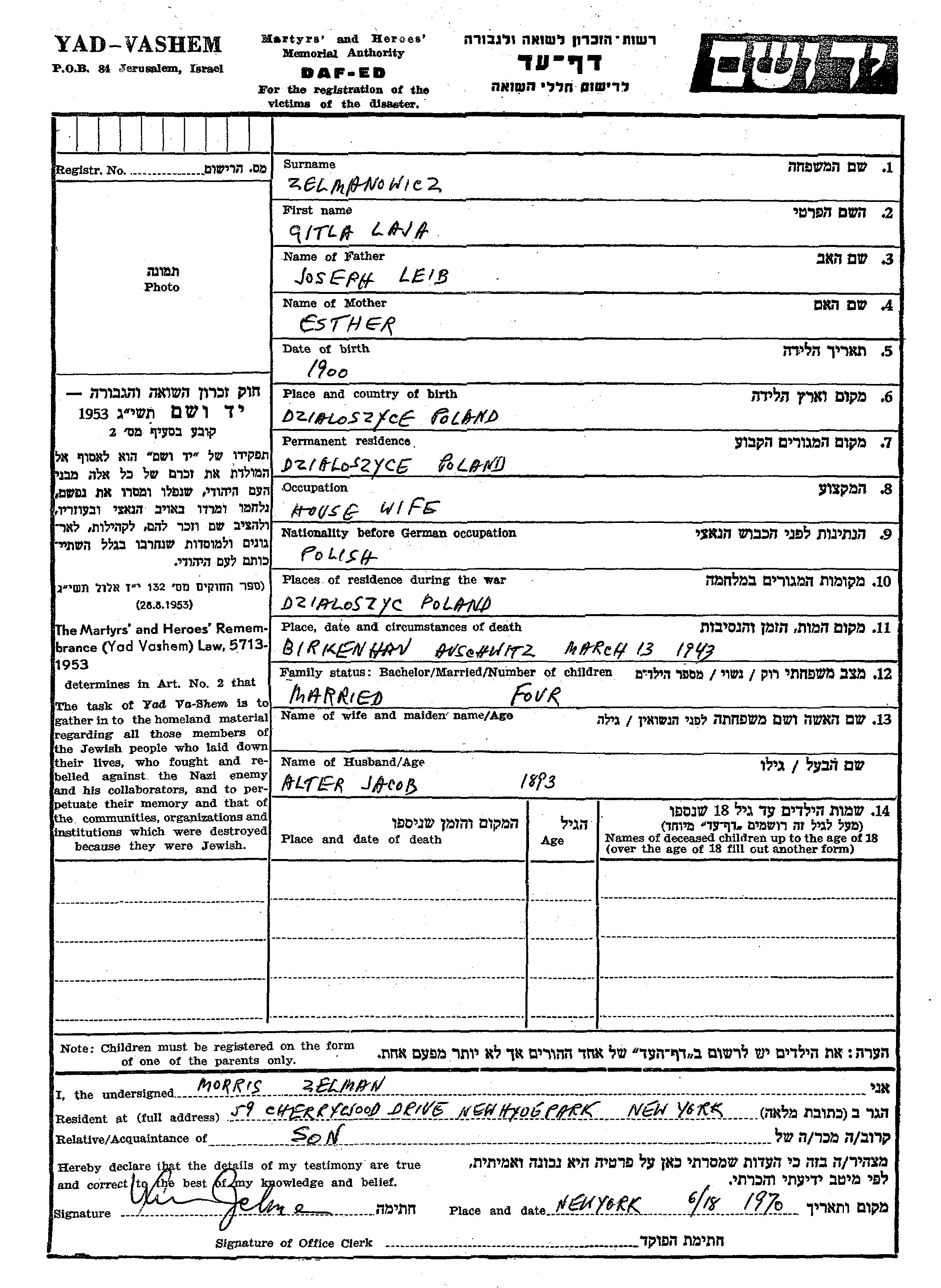 Zelmanowicz Gitla Laja 1900 Dzialoszyce, Pologne Feuille de témoignage