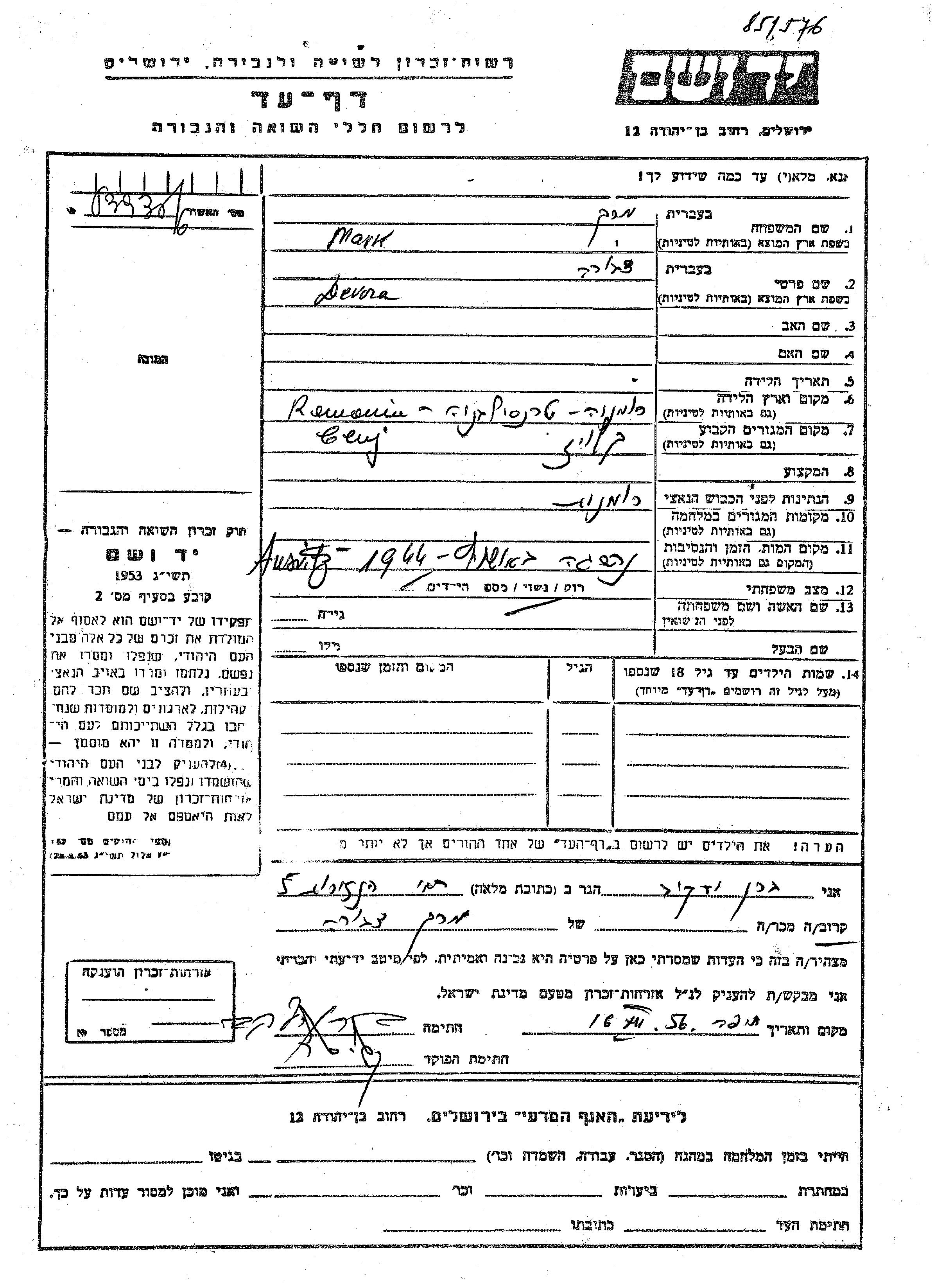 Yad Vashem - Pages of Testimony Names Memorial Collection