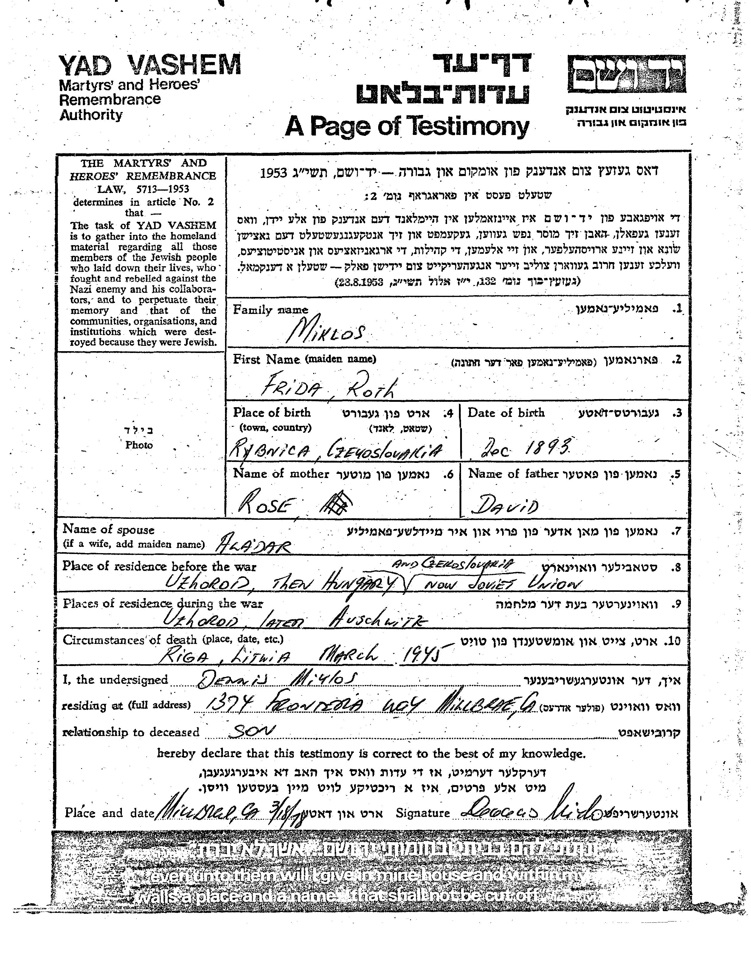 Miklos Frida 1893 Uzhorod, Tchécoslovaquie Feuille de témoignage