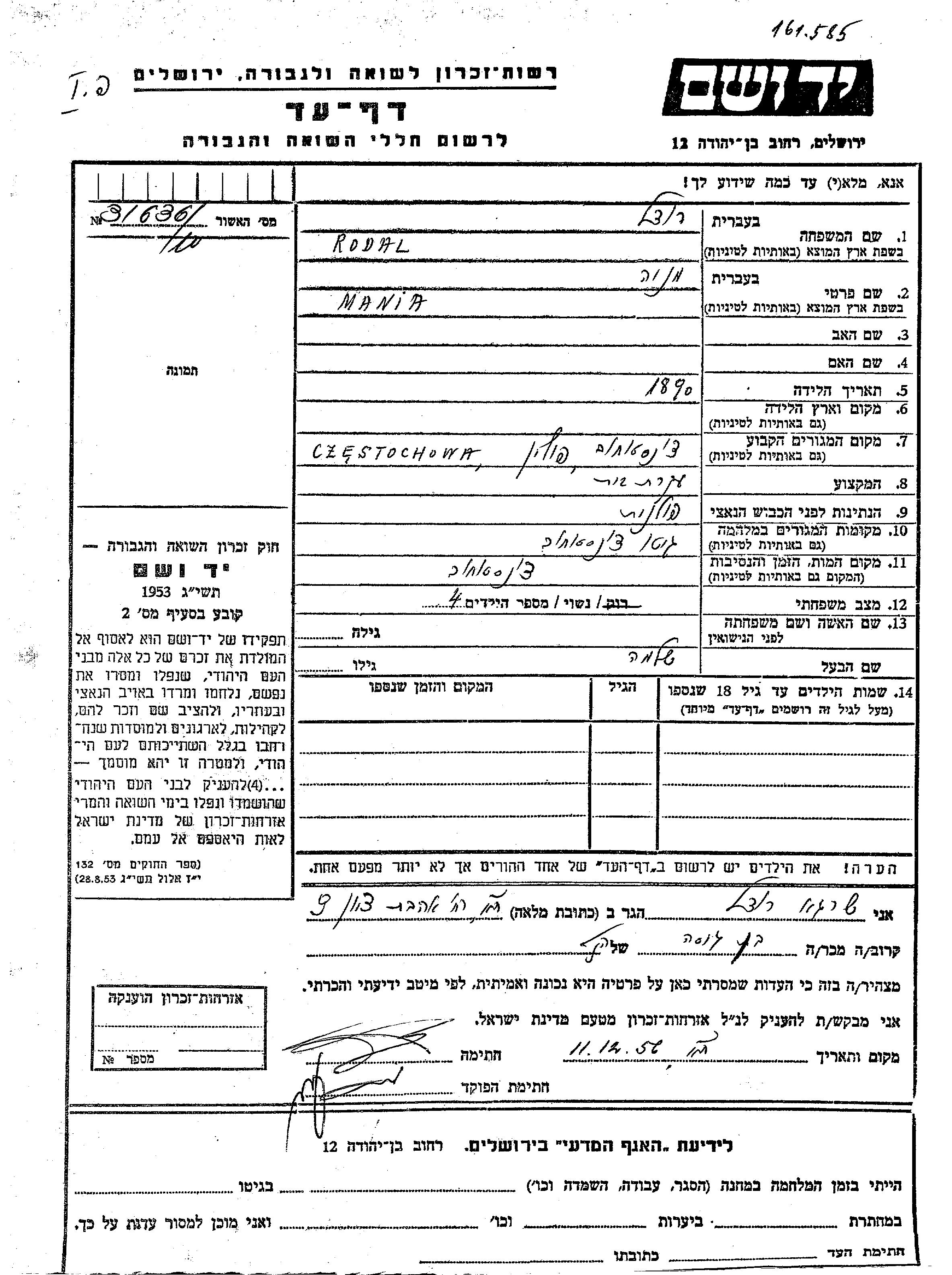 Mania Rodal est née en 1890. Elle était Femme au foyer et Mariée à Shlomo. Avant la seconde guerre mondiale elle vivait à Czestochowa, Pologne. Pendant la guerre, elle était à Czestochowa, Pologne.