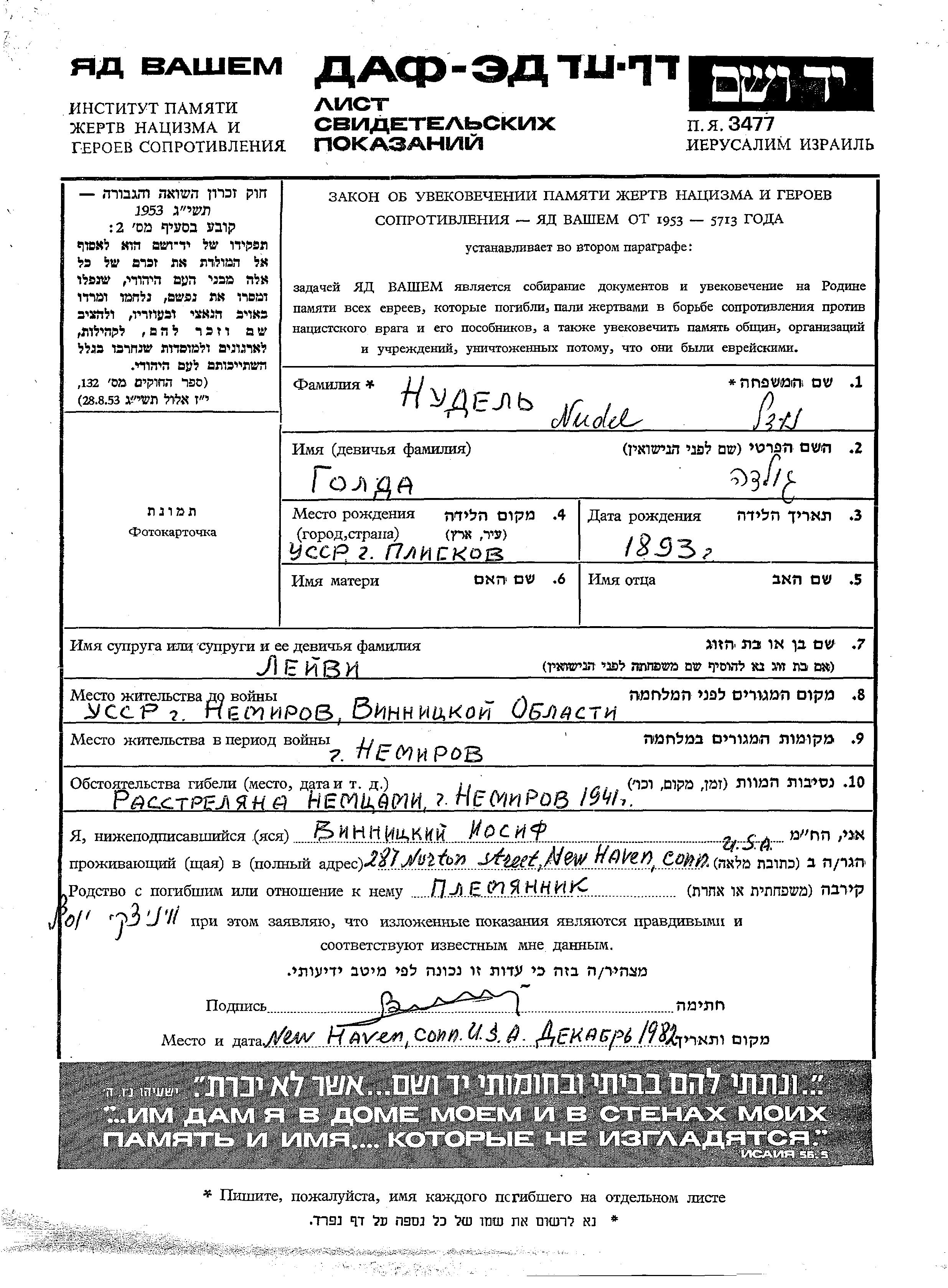 Nudel Golda 1893 Nemirov, Ukraine (URSS) Feuille de témoignage