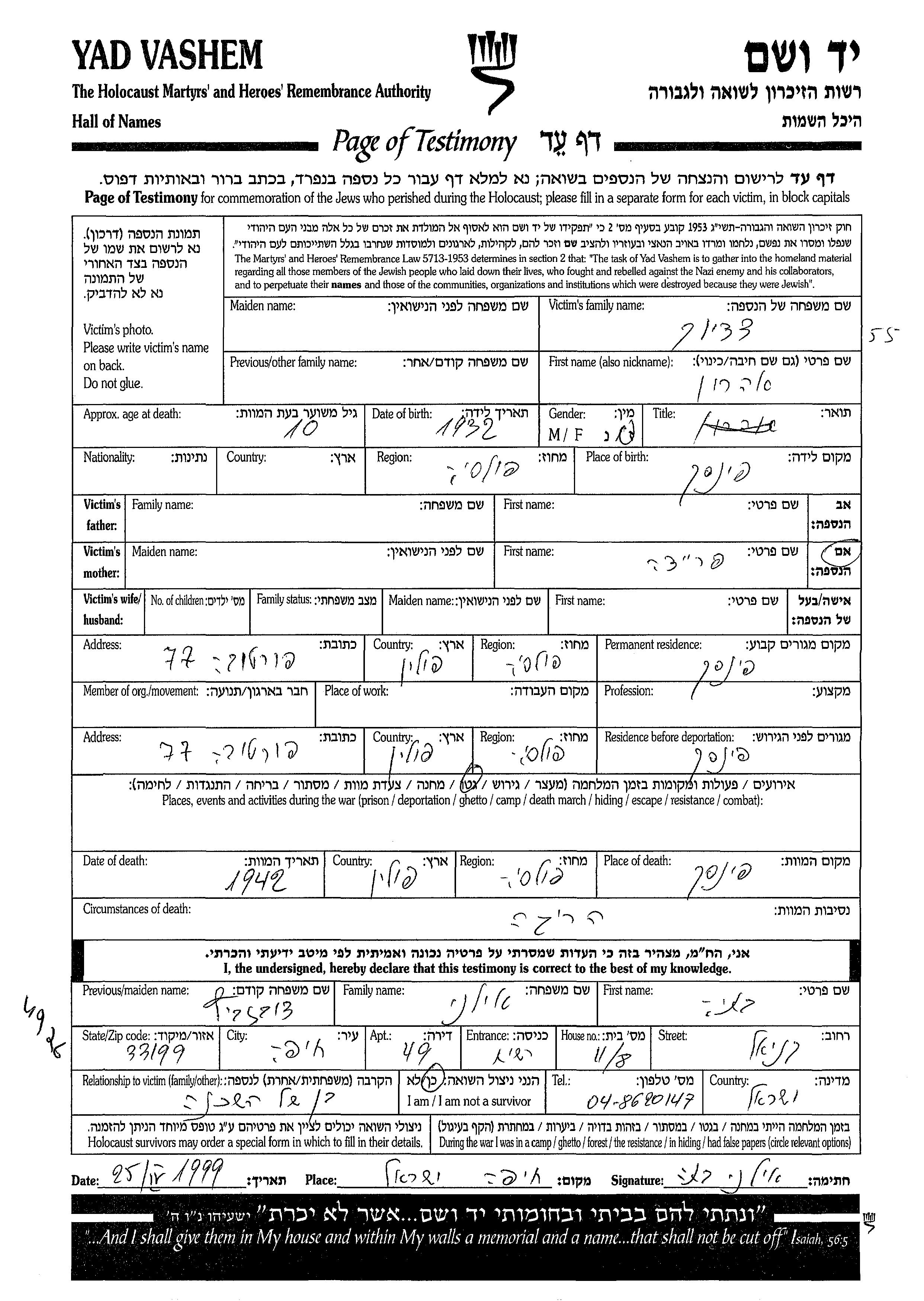 Yad Vashem - Pages of Testimony Names Memorial Collection