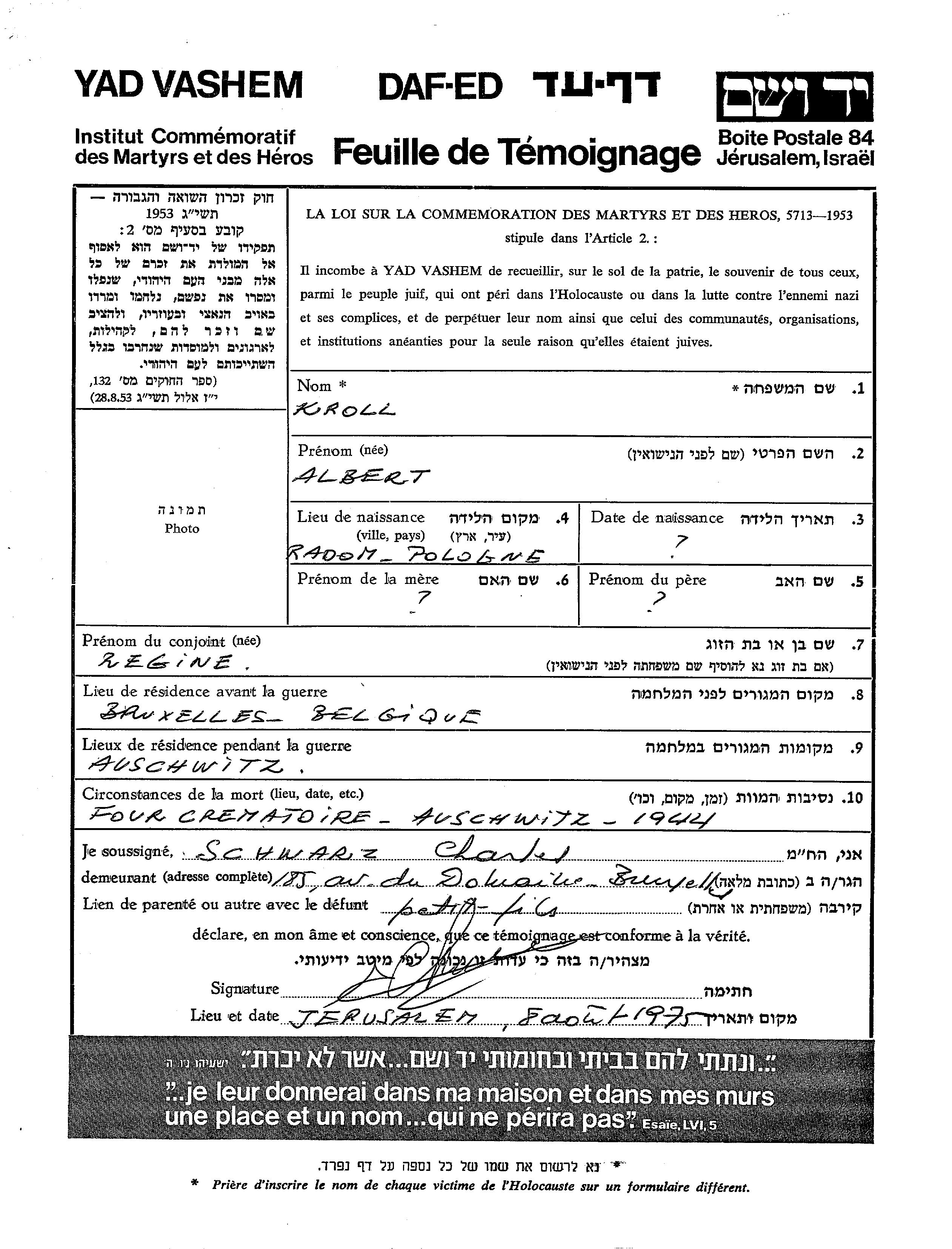 Albert Kroll est né à Radom, Pologne. Il était Mariée à Regine. Avant la seconde guerre mondiale il vivait à Bruxelles, Belgique. Au cours de la guerre, il était à Auschwitz, Pologne.