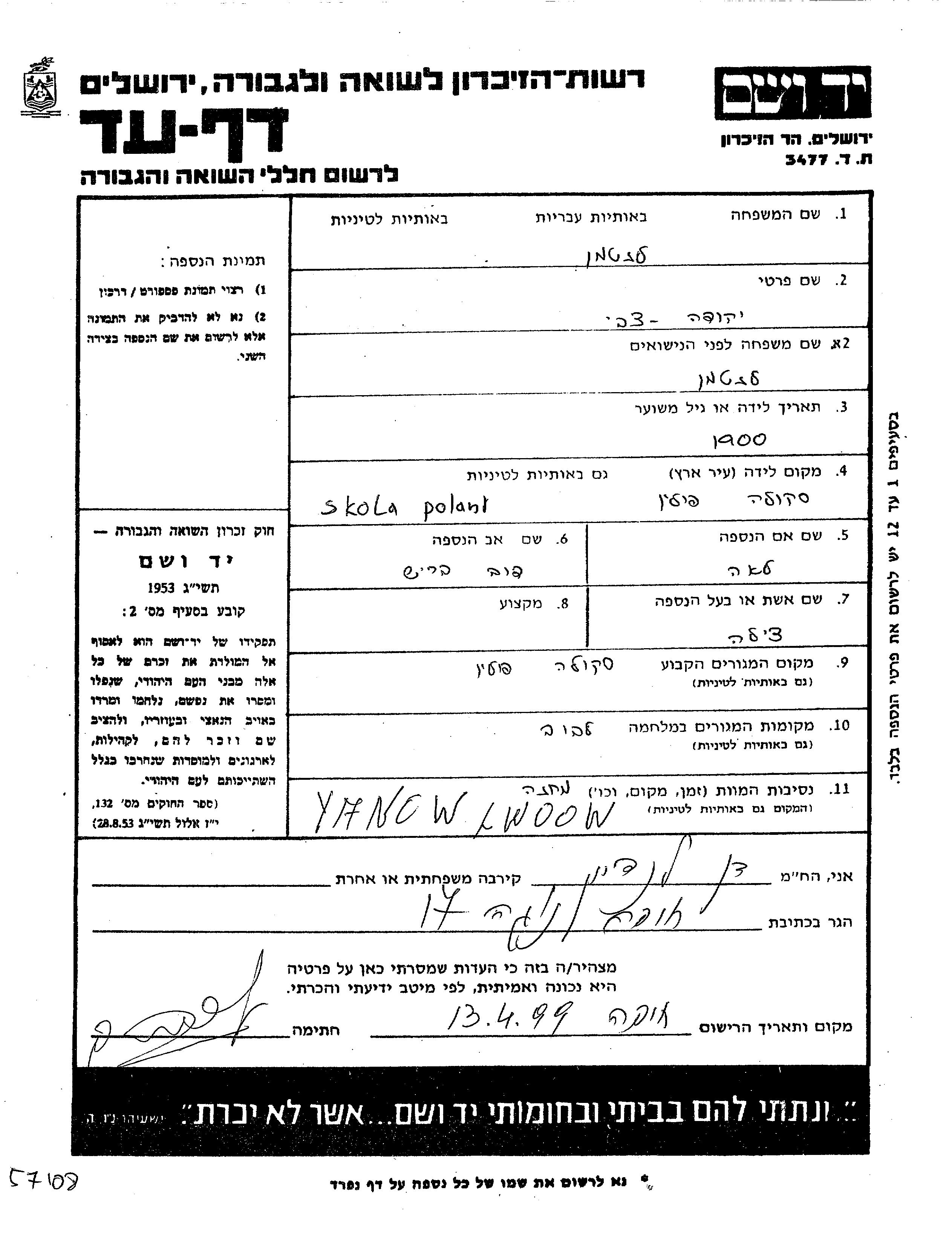 Yad Vashem - Pages of Testimony Names Memorial Collection