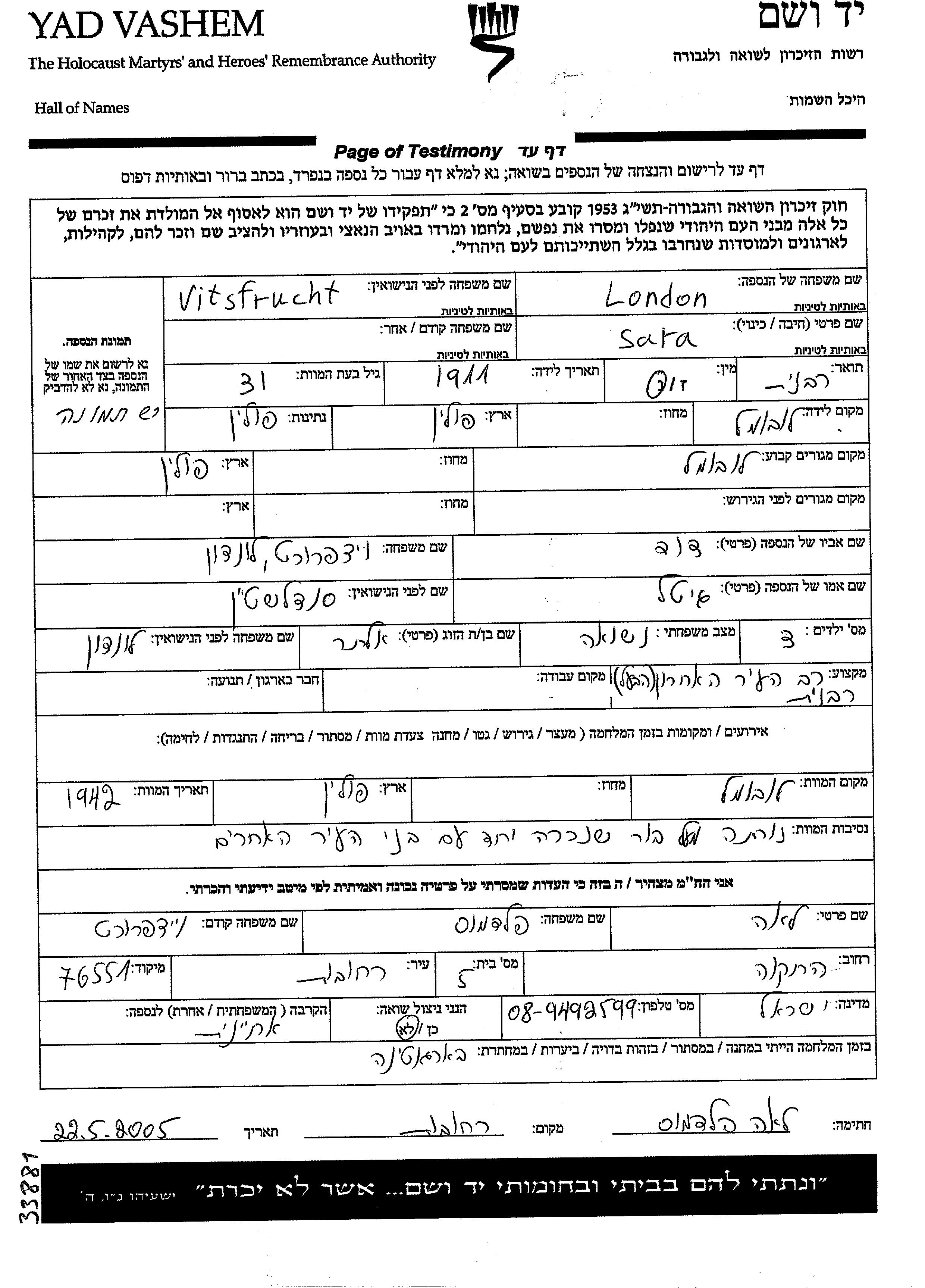 Rabanit Sara London née Vitsfrucht est née à Lubomel, Pologne en 1911, fille de David et de Gitel née Sandelshtein. Elle était Femme de rabbin et Mariée à Alter. Avant la seconde guerre mondiale elle vivait à Lubomel, Pologne. Pendant la guerre, elle était à Lubomel, Pologne.