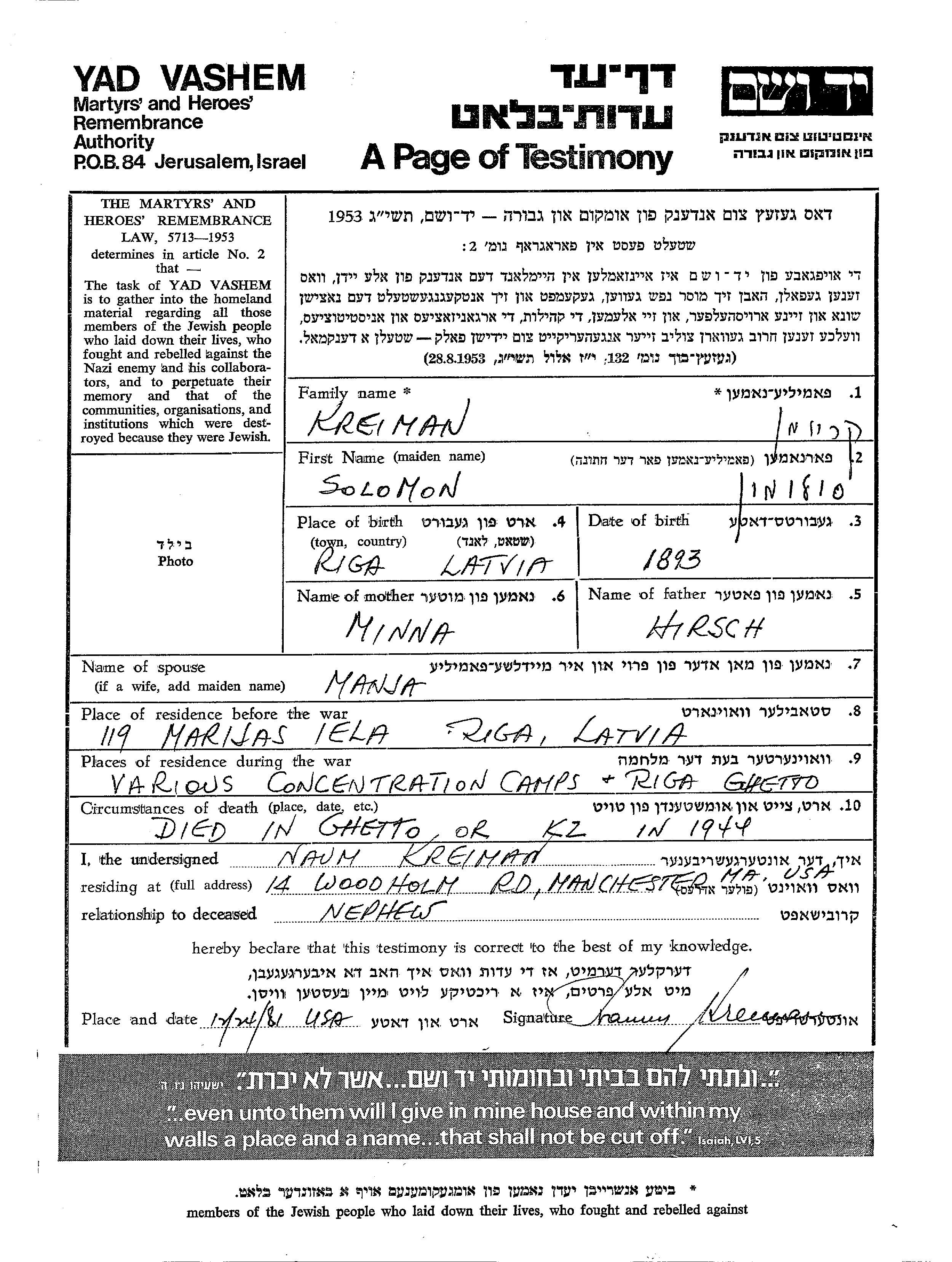 Kreiman Solomon 1893 Riga, Lettonie Feuille de témoignage