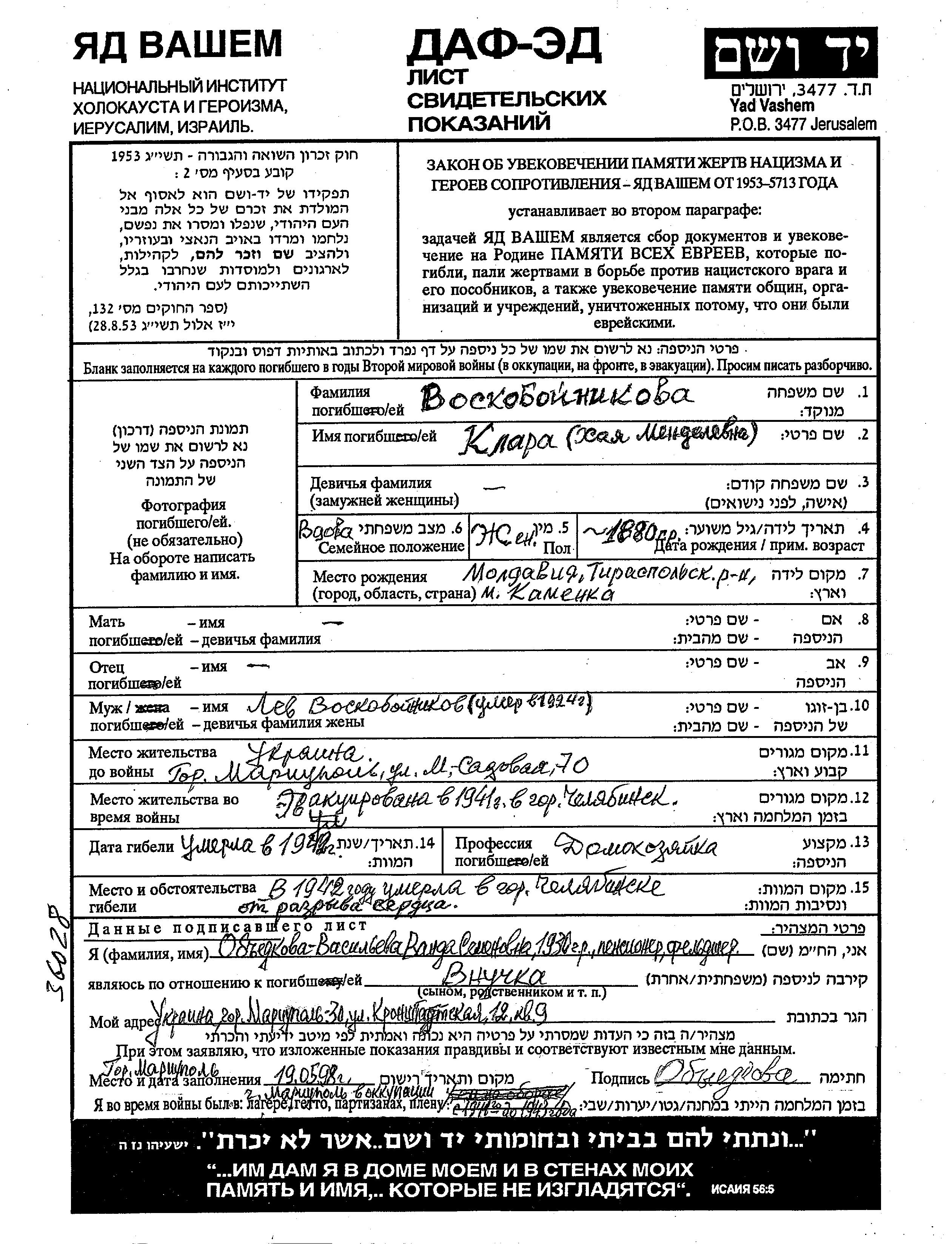 Voskoboinikova Khaya Klara 1880 Mariupol, Ukraine (URSS) Feuille de témoignage