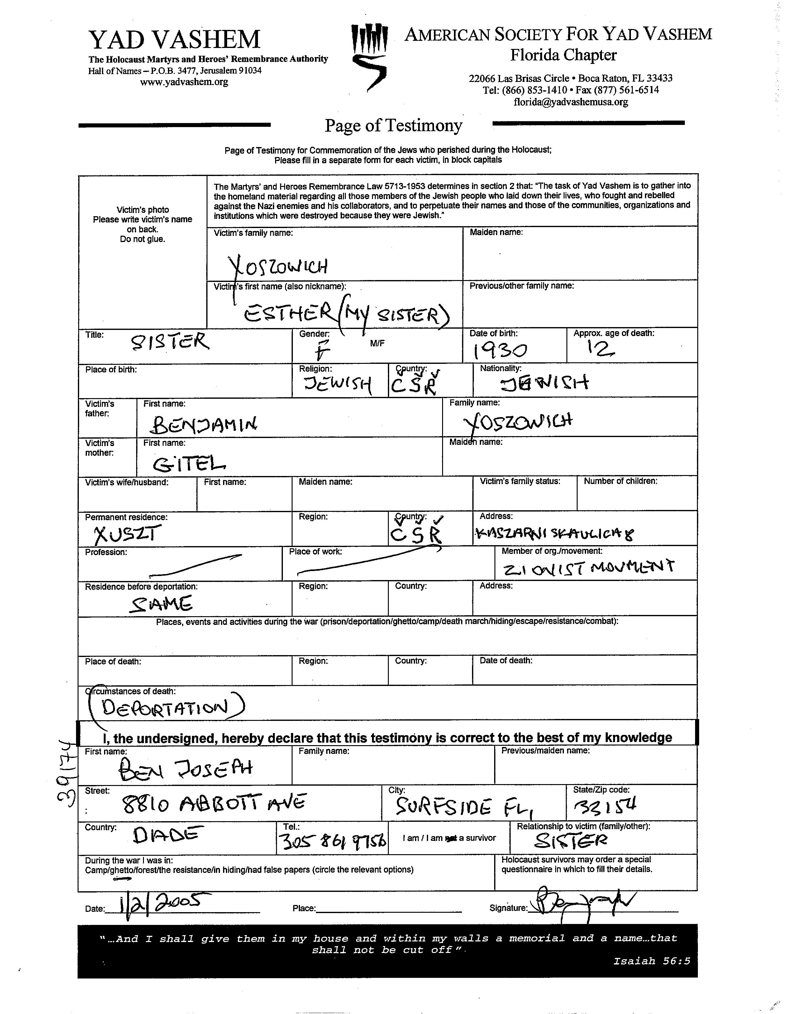 Yoszowich Esther 1930 Chust, Tchécoslovaquie Feuille de témoignage