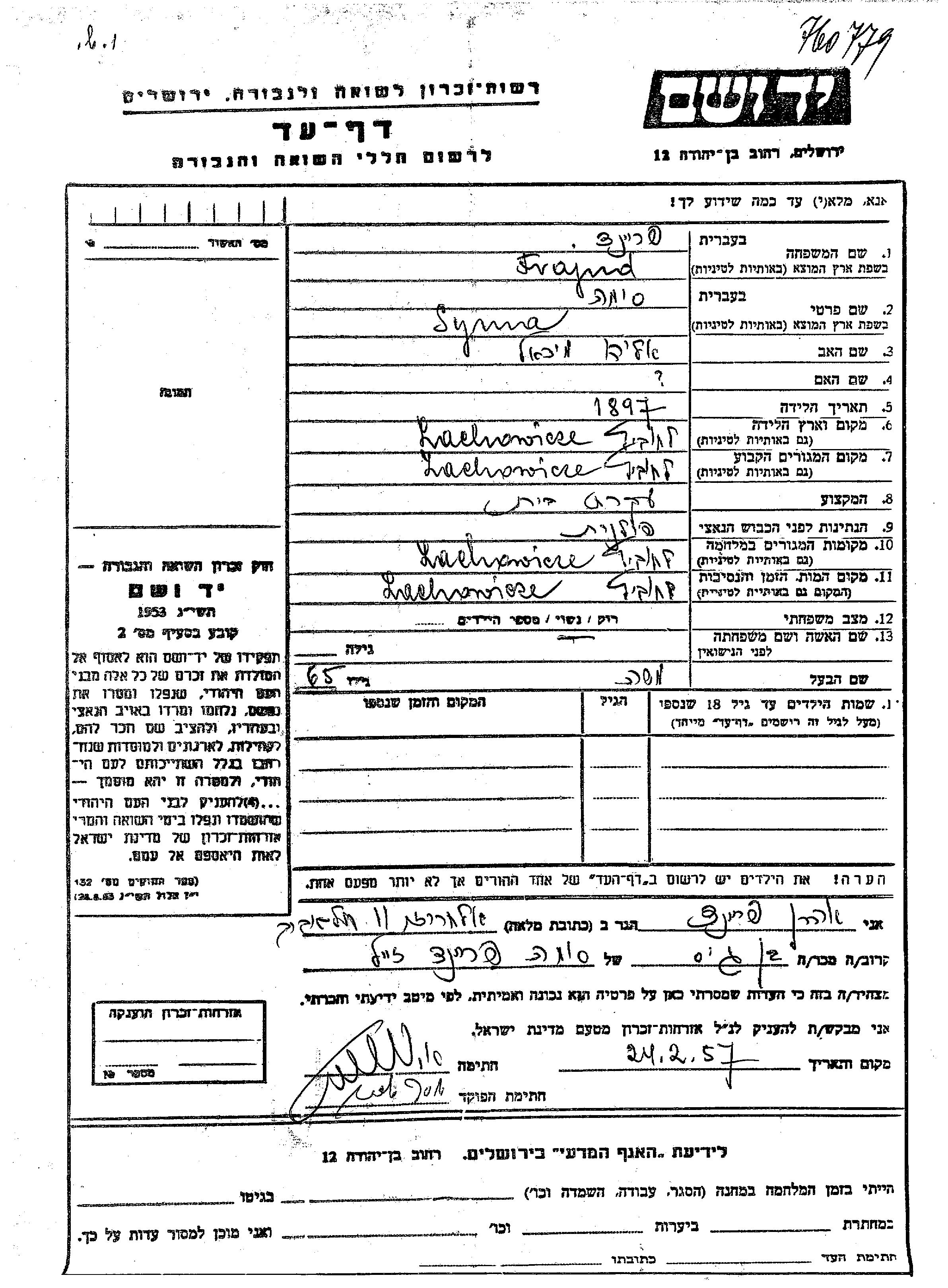 Frajnd Syma 1897 Lachowice, Pologne Feuille de témoignage