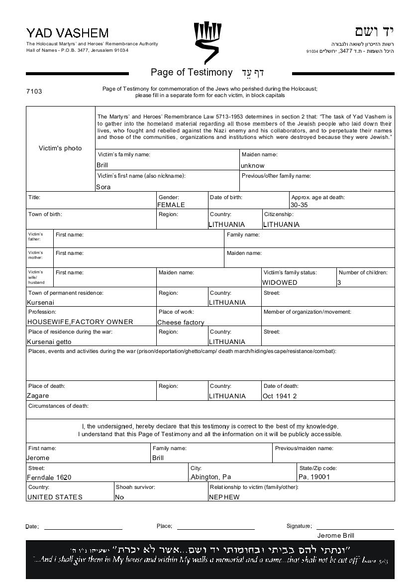 Sora Brill est née à Lituanie. Elle était Propriétaire d'usine et Veufveuve. Avant la seconde guerre mondiale elle vivait à Kuršėnai, Lituanie. Pendant la guerre, elle était à Ghetto.