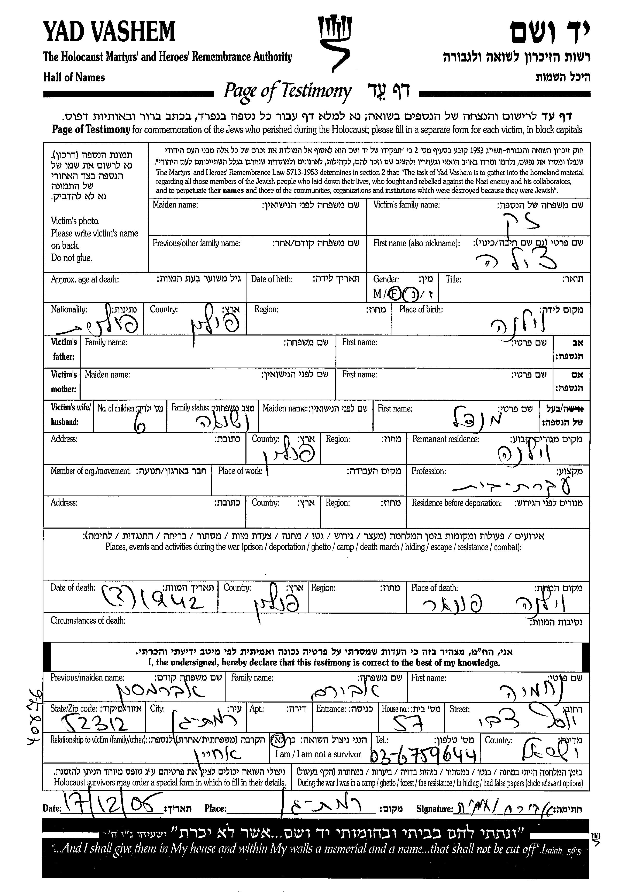 Yad Vashem - Pages of Testimony Names Memorial Collection