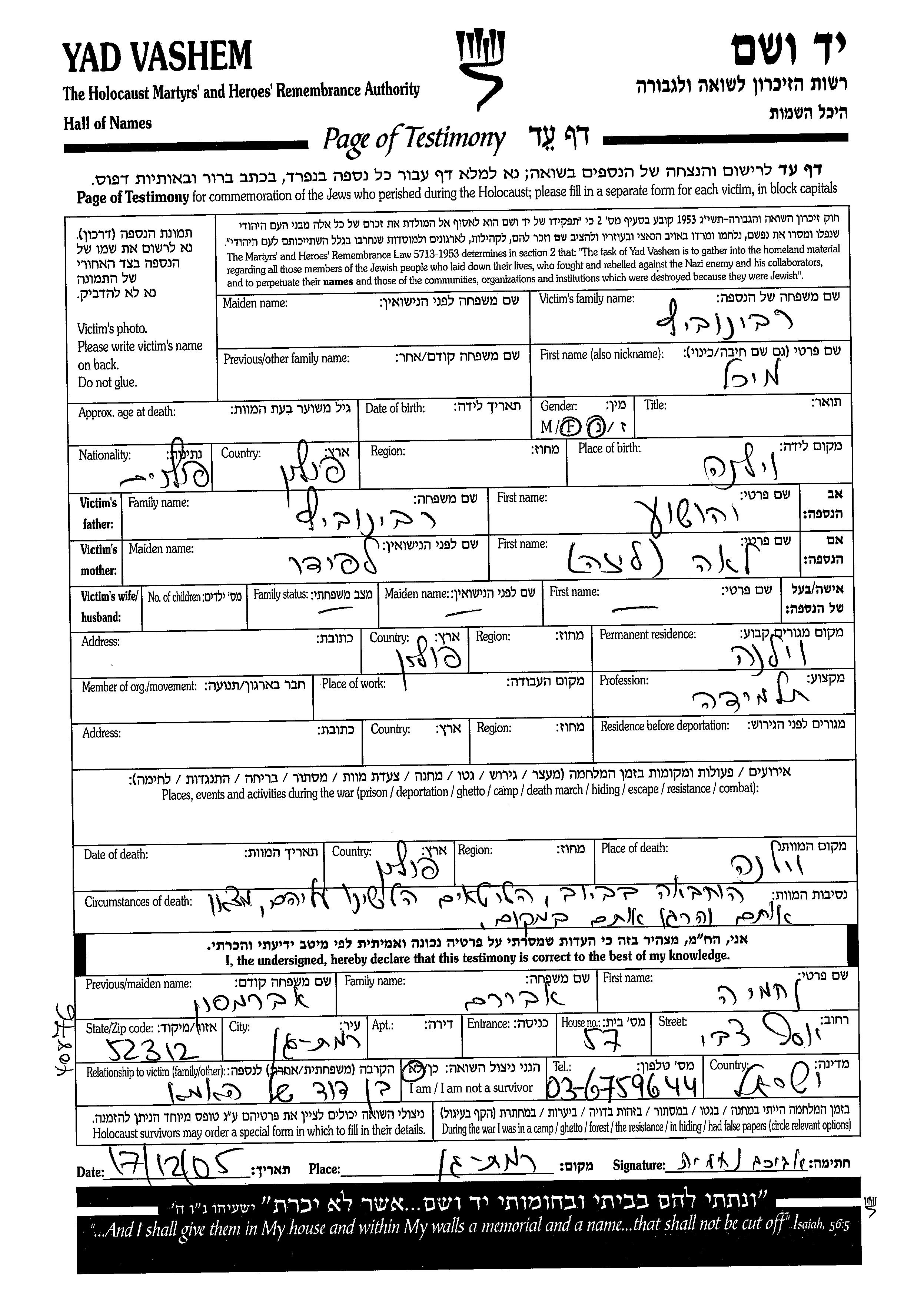Yad Vashem - Pages of Testimony Names Memorial Collection