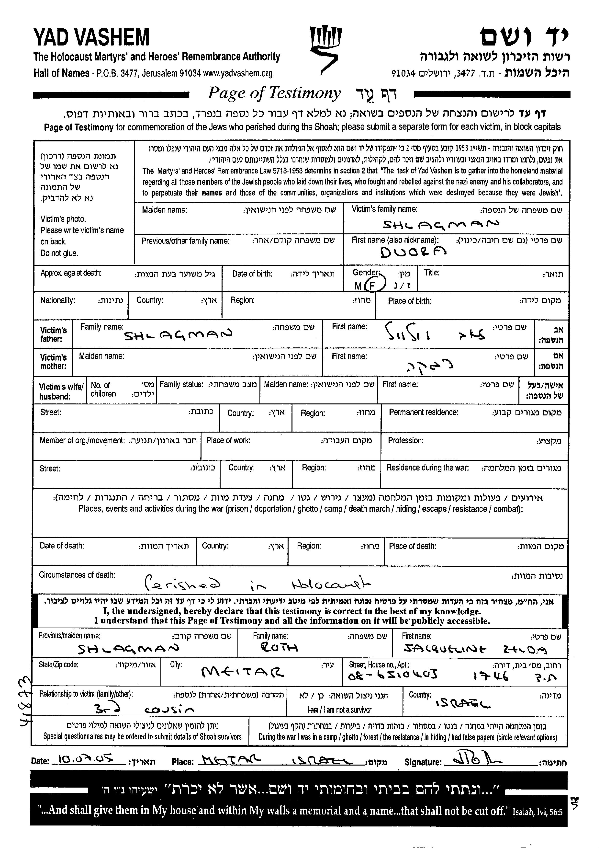 Shlagman Dwora endroit inconnu, Feuille de témoignage