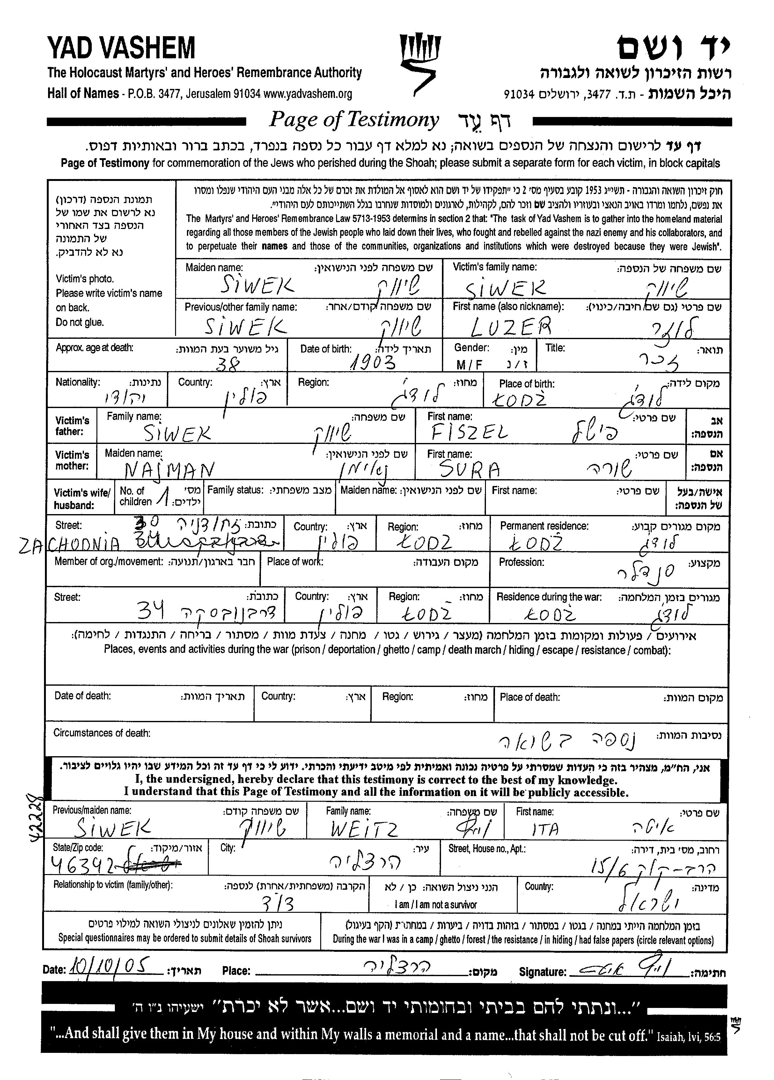 Luzer Siwek est né à Lodz, Pologne en 1903, fils de Fishel et de Shura Sura née Noiman. Il était Cordonnier. Avant la seconde guerre mondiale il vivait à Lodz, Pologne. Au cours de la guerre, il était à Lodz, Pologne.