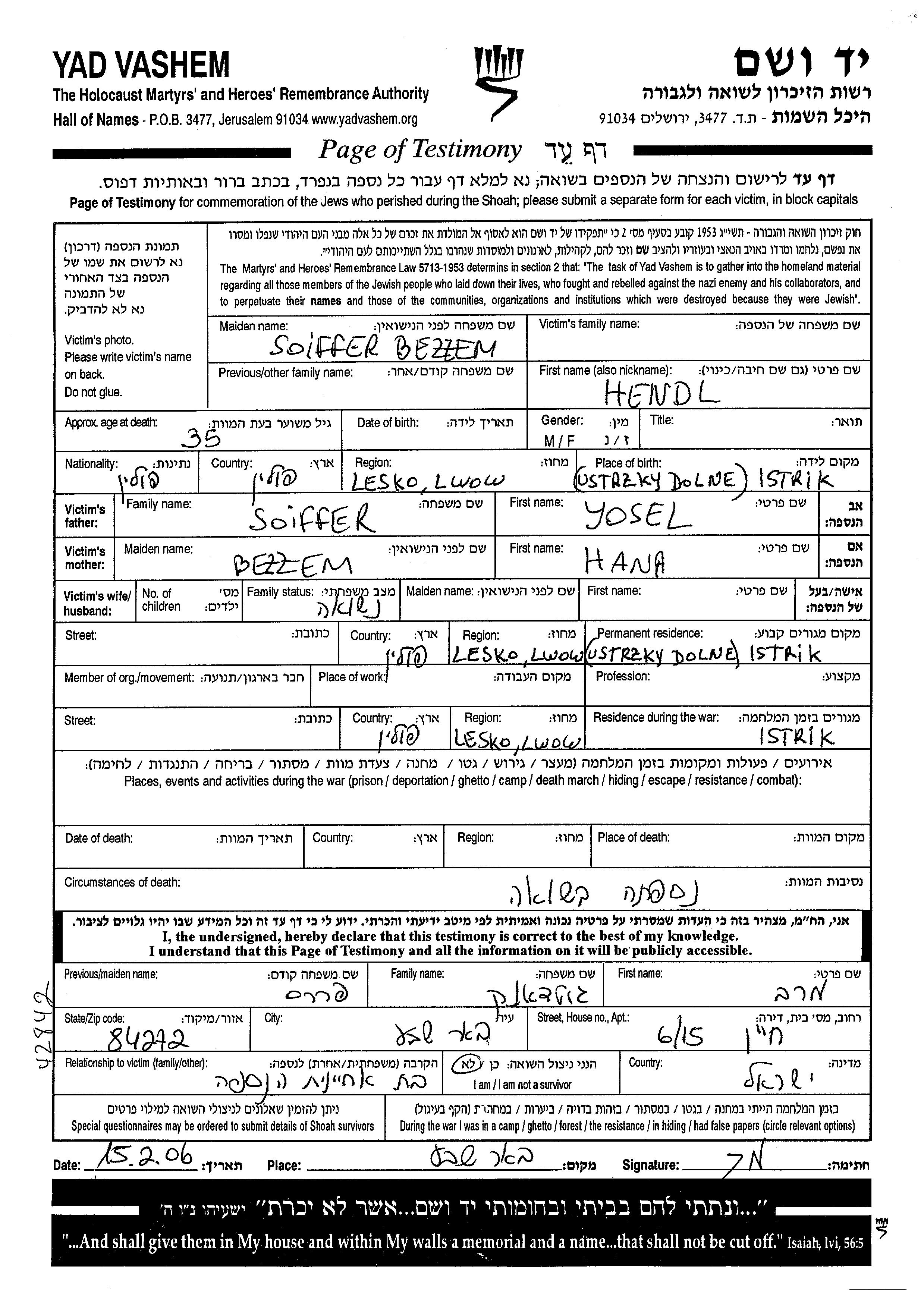 Hendl nom inconnu née Soiffer est née à Istrik, Pologne, fille de Yosel et de Hana née Bezzem. Elle était Mariée. Avant la seconde guerre mondiale elle vivait à Istrik, Pologne. Pendant la guerre, elle était à Istrik, Pologne.