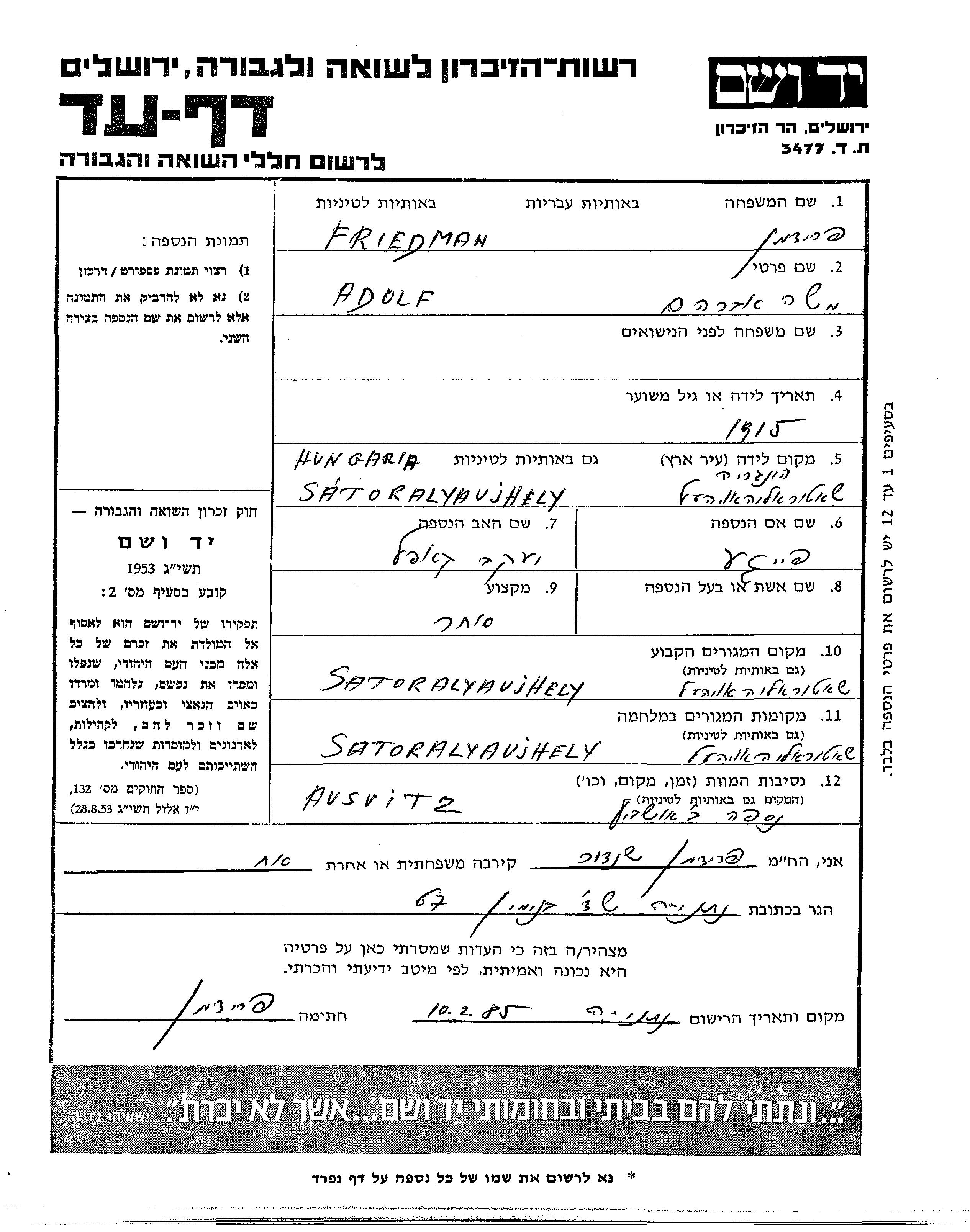 Friedman Adolf Moshe Avraham 1915 Satoralya Ujhely, Hongrie Feuille de témoignage
